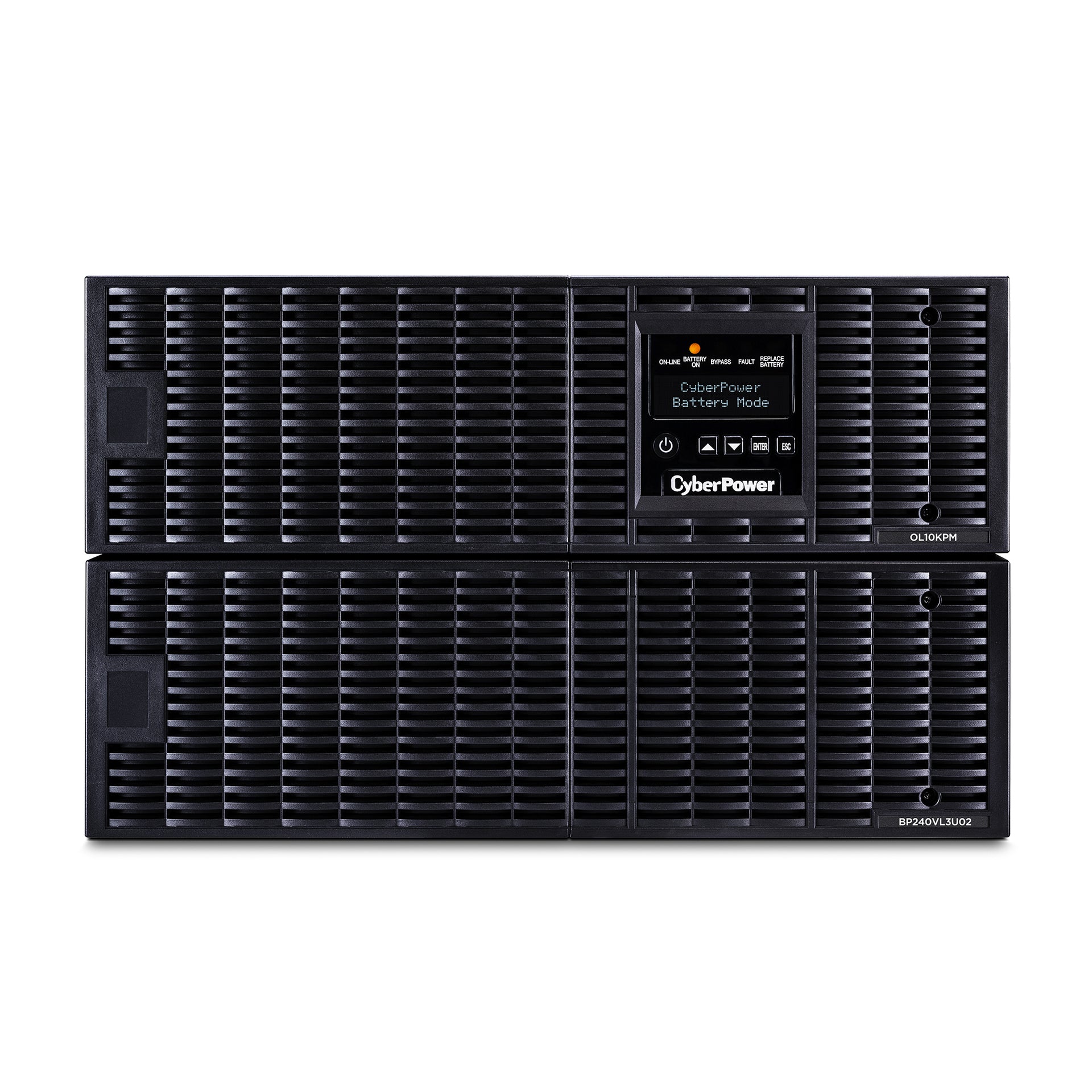 The CyberPower Smart App Online OL10KRT is a 6U rack/tower double-conversion UPS. It provides sine wave output to multiple types of critical IT infrastructure requiring seamless power protection. The OL10KRT is generator compatible and delivers consistent 200-240 V power with zero-transfer time. Automatic-bypass ensures connected equipment continues to operate seamlessly when an overload or internal fault is detected. The OL10KRT features a removable LCD control panel to reposition it in a more convenient location (with optional DB-26 cable), and it has a RMCARD205 pre-installed network card. Smart-battery management charging technology increases battery life by up to 50%. Fast-charge technology helps replenish battery charge from 0-90% in five hours, regardless of the number of Extended Battery Modules (EBM) connected. The energy-saving GreenPower UPS™ ECO Mode allows the UPS to reach up to 97% efficiency to reduce power consumption and thermal dissipation. This UPS can use the BP240VL3U01 extended battery module for more runtime. The OL10KRT comes with a three-year warranty (including batteries) and a $300,000 connected equipment guarantee. Double-Conversion Topology Provides consistent, clean, and nearly perfect sine wave output power, regardless of the condition of input power. UPS systems with this technology operate on isolated DC power 100% of the time and have a zero-transfer time because they electronically switch to battery (vs. using relays which can take 4-12 ms to switch). Double-conversion UPS systems are designed for high-end system components, enterprise servers, lab equipment, and other sensitive electronic devices. Sine Wave Output Provides power protection to ENERGY STAR® 6.0 systems with Active PFC power supplies. Removable LCD Control Panel Displays 24 UPS status readings and allows configuration of 27 operation settings. The onboard event log will record and display the five most recent UPS system events. The LCD control panel can be removed and mounted in a more convenient location, up to ten feet away from the UPS (with optional DB-26 cable). Users can manage, setup, and control various operation settings, can scroll through multiple UPS status readings and run select UPS diagnostic tests. Multiple Language Options The LCD control panel can be configured to English, Spanish, French, or German for use in multiple countries. Extended Battery Module (EBM) Add runtime by connecting more EBMs. The Smart App Online series of UPS systems allow for up to ten EBMs to be connected in a daisy-chain. Fast Charge Technology Enables Smart App Online UPS systems with multiple EBMs to charge batteries from 0-90% capacity in five hours. This is possible thanks to the built-in charger in each EBM. Smart Battery Management (SBM) Extends the service life of Smart App Online UPS batteries and reduces excessive heat during charge cycles by using a three-stage charging process. The first stage charges the battery to full capacity. The second stage enters float mode. The third stage turns the charger OFF to allow the batteries to naturally discharge (rest) for up to 27 days or until they reach a low-voltage set point. SBM continuously monitors the UPS to restart the charge cycle as needed, ensuring that runtimes are maintained. GreenPower UPS™ ECO Mode Improves UPS efficiency up to 97% to reduce electrical and cooling costs. Hot-Swappable Batteries Eliminate downtime related to UPS maintenance for continuous power availability. Generator Compatible Disregards rapid changes in input frequency like those found in the output waveform of some generator sets. This allows the UPS to continue to operate in normal Online Mode vs. switching to Battery Mode when the power source is a generator set. Converter Mode Provides the ability to set the UPS output frequency (50 Hz or 60 Hz), regardless of the input frequency. This is beneficial where the connected equipment must operate on a different frequency than provided by local electric utility. Local and Remote Management Monitor and manage the UPS system locally via USB or serial connection, or remotely via the pre-installed RMCARD205 network card. Access UPS status, configuration settings, event logs, and status records, and more. Users can also setup email notifications. Rack or Tower Installation All the hardware accessories to rack mount the UPS in a standard 4-post 19†rack, or install as a tower unit, is included at no extra cost. PowerPanel® Business Edition Software A robust and feature rich power monitoring and management tool for physical or virtual environments, PowerPanel Business Edition offers local (Agent) or remote (Client) functionality to automate graceful shutdown of IT equipment. Installing PowerPanel Business Edition Center provides centralized monitoring and management of PPBE Agents and Clients on the local network in addition to all CyberPower devices. PPBE is FREE for download on the Downloads tab above. Three-Year Warranty CyberPower will repair or replace a defective UPS system (including batteries) within three years of the purchase date. Connected Equipment Guarantee CyberPower will repair or replace properly connected equipment if it is damaged by a power surge.