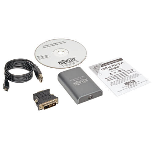 The U244-001-R USB 2.0 to DVI/VGA External Multi-Monitor Video Card displays video on a DVI or VGA monitor or projector via your computer or laptop’s USB 2.0 port. You can extend video from your primary display to another, duplicate the same video on both displays or change the second display to your primary display. The adapter is an ideal tool for multitasking, viewing large spreadsheets, editing documents, giving presentations at trade shows or watching movies and playing games on large screens. You can add up to six U244-001-R external video graphics card adapters, each attached to its own USB 2.0 port, to connect a total of seven displays to the video source. Adding or removing a monitor is easy—no need to reboot the system afterward. No external power supply is necessary. First, install the drivers using the included CD. Then, connect the adapter to the display and the source using a DVI or VGA cable and the included USB 2.0 cable, respectively. A DVI-to-VGA adapter is also included for connecting to a VGA cable. The U244-001-R supports high-definition video resolutions up to 1920 x 1080 (1080p) @ 60hz and features 128 MB DDR SDRAM of memory. Compatible with 32- and 64-bit Windows 7 and later, as well as 32- and 64-bit Intel Mac OS X 10.8.3 and later / Mac 10.11. The adapter also works with Surface tablets running Windows 8 Pro or later / Windows 10. Easy to Add Displays Extend video to a second monitor, duplicate the same video on both monitors, or make the second monitor your primary display Ideal for multitasking, viewing spreadsheet data, editing documents, giving presentations, watching movies and playing video games Add up to 6 adapters, each connected to its own USB 2.0 port, for a total of 7 displays No external power supply necessary No need to reboot system after adding or removing a monitor Vibrant, Superior Video Quality Supports high-definition video resolutions up to 1920 x 1080 (1080p) @ 60 Hz Features 128 MB DDR SDRAM of memory Uses DisplayLink DL-165 chipset Resumes automatically from hibernation and suspend modes PC and Mac Compatible Works with 32- and 64-bit Windows 7 and later, Windows 10 Works with 32- and 64-bit Intel Mac OS X 10.8.3 and later. Mac 10.11 Works with Surface tablets running Windows 8 Pro or later