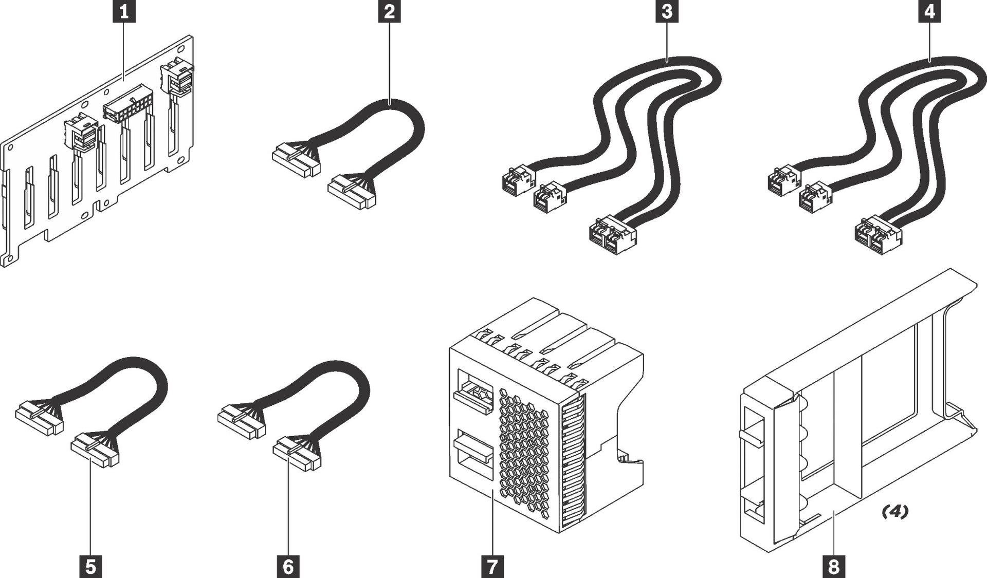 1 2U 2.5" SATA/SAS 8-Bay backplane 2 SR650 second& third 8x2.5" or 12x3.5" NVME HDD backplane power cable 3 SR650 8x2.5" HDD backplane signal cable 4 SR550 8x2.5" HDD backplane signal cable 5 SR550 second 8x2.5" HDD backplane power cable, SR650 first 8x3.5", 12x3.5" or 8x2.5" HDD backplane power cable 6 SR550 first 8x2.5" HDD backplane power cable 7 4x1 2.5" HDD filler 8 1x1 2.5" HDD fillers (4)
