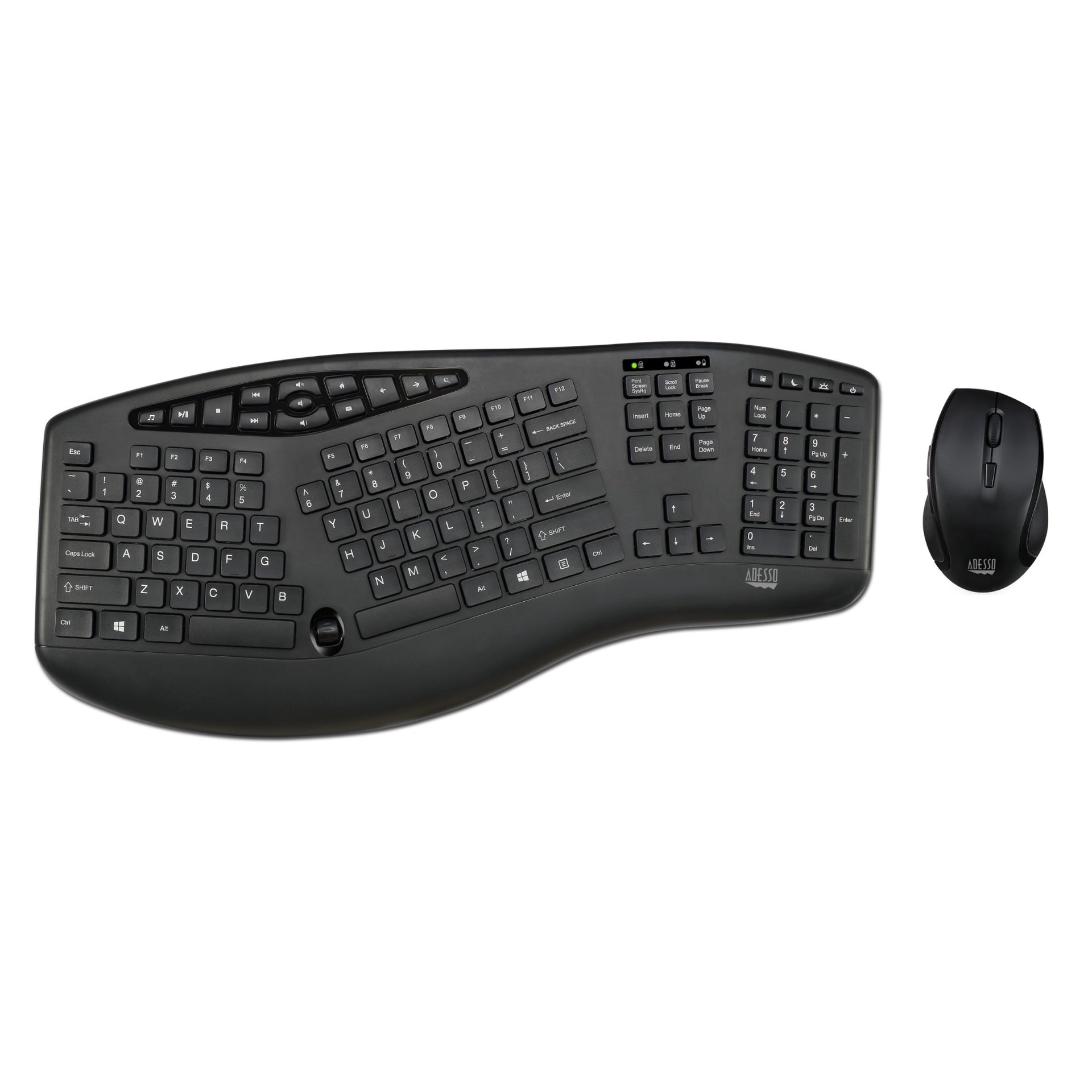 The Adesso Wireless Ergonomic Keyboard & Optical Mouse offer users two advanced input devices with ergonomic design, multifunctional features and a wireless range of up to 30 feet. The design of this keyboard with splitted key zones and gently sloped encourages natural position of hands, wrists, and forearm in maximum comfort for long use. The new chiclet keycap with its larger keycap surface makes typing easier and blends in with the keyboard to make a stylish design. The included wireless optical mouse not just provides comfortable ergonomic design but also equips with a DPI switch for changing resolution (800/1200/1600) and two Internet navigation buttons.