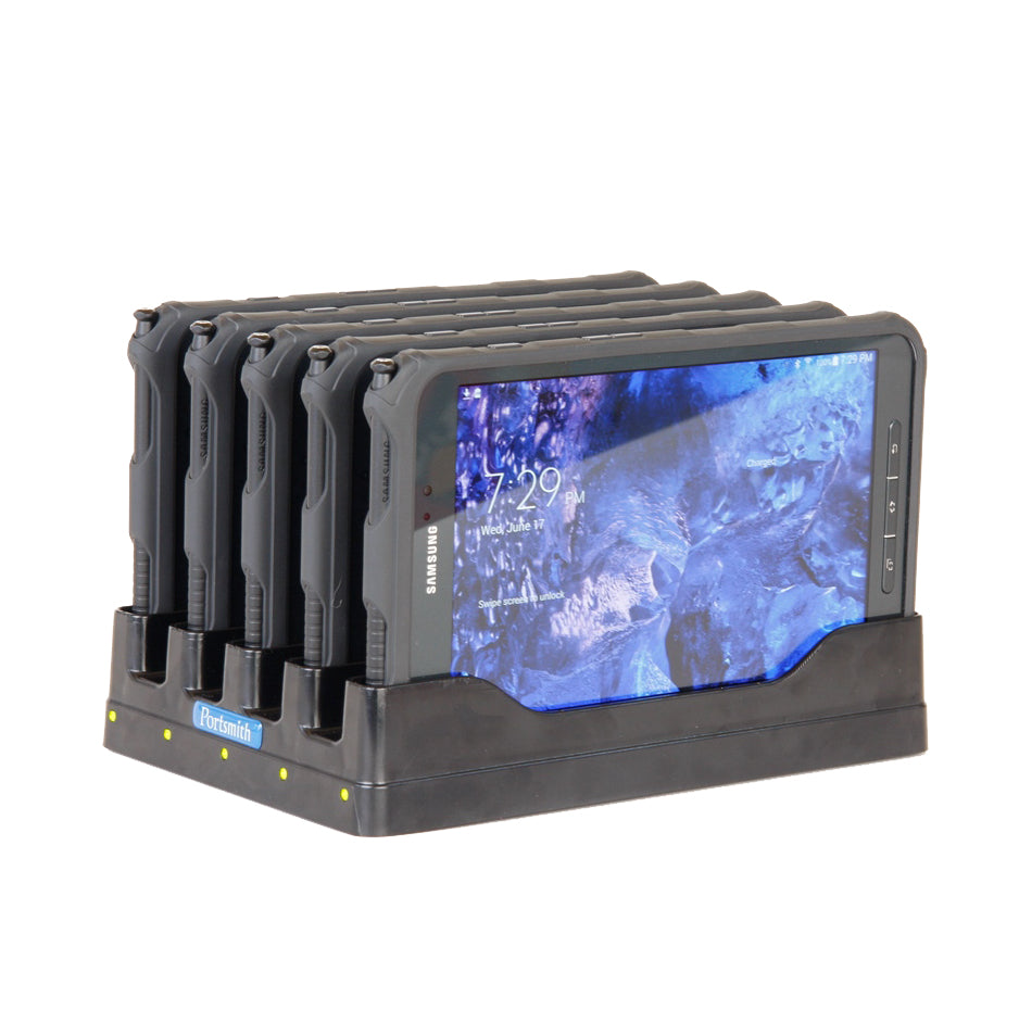 Charge Five Galaxy Tab Active or Active2 Tablets at OnceCharge up to five Galaxy Tab Active or Active 2 tablets in any combination, from a single power supply. Your charging stations will be neat and organized. Also available soon is the Tab Active Pro Charging Dock.Easy and Secure ConnectionFive molded slots and integrated pogo pins mean Galaxy Tab Active and Active2 tablets align perfectly with charging pins. It’s simple to quickly insert and remove your tablets with one hand.Durable and Long-LastingWith strong ABS plastic construction, the Portsmith charging dock is every bit as durable as the ruggedized Galaxy Tab Active and Active2.Cabinet or Desktop UsePlace your Portsmith charging docks on a desktop, or secure them in a locking cabinet. They’re safe to use in an enclosed space and will not overheat.Fast Charging with Regulated PowerThe Portsmith charging dock is designed to charge the Galaxy Tab Active and Active2 at maximum speed. Each slot remains powered off until a Galaxy Tab Active or Active2 is inserted, and if a fault is ever sensed, a protection circuit shuts the slot down.Confirmation at a GlanceLED indicator lights show charging status or a slot fault at a glance.Multiple Certifications Ensure Safe OperationThe Portsmith Galaxy Tab Active and Active2 charging dock meets FCC 15-B Class B and CE Mark certification, for safe operation in the U.S., Canada, Europe, Australia and New Zealand.