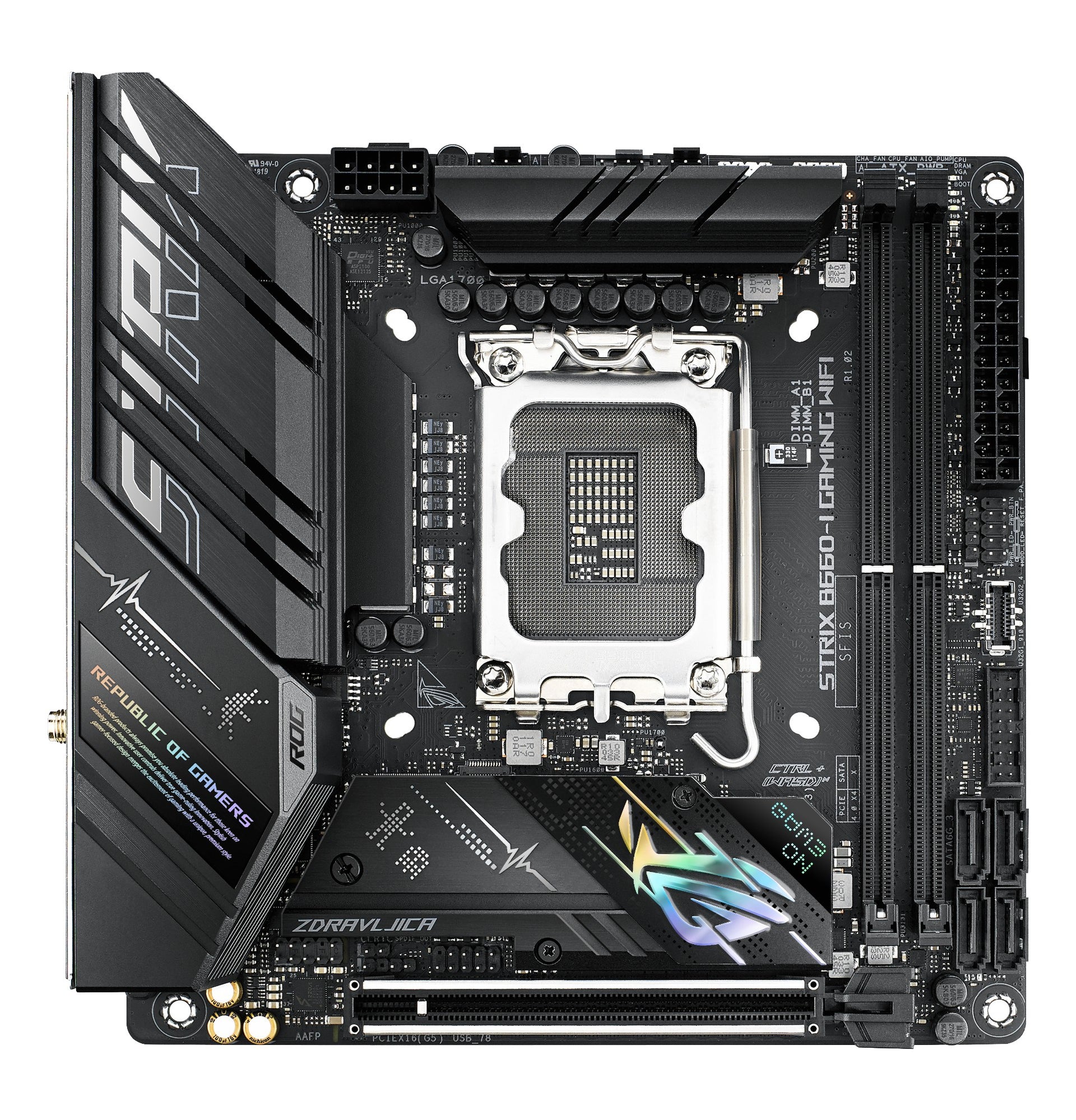 The ROG Strix B660-I Gaming WiFi packs premium-grade power delivery into a compact mini-ITX form factor to unleash the full force of 12th Gen Intel® Core™ processors. Framerates and load times can be boosted even further by all-new support for DDR5 memory and PCIe® 5.0, plus AI-enhanced controls and exclusive ASUS Enhanced Memory Profile tuning. Meanwhile, onboard WiFi 6 and two PCIe 4.0 M.2 slots bring lightning-fast performance to an endless variety of scenarios. On top of all that, DIY-friendly innovations help simplify the PC building process, so even novice builders can get right into serious gaming. TEAMED POWER STAGES 8+1 power stages combine high-side and low-side MOSFETS and drivers into a single package, delivering the power and efficiency that the latest Intel processors can take full advantage of. ALLOY CHOKES AND DURABLE CAPACITORS High-end chokes and durable capacitors are engineered to resist extreme temperatures, enabling performance that exceeds industry standards. PROCOOL POWER CONNECTOR The ASUS ProCool socket is built to exacting specifications to ensure flush contact with the PSU power lines, enabling lower impedance and better heat dissipation. DIGI+ POWER CONTROL The Digi+ voltage regulator module (VRM) is one of the finest in the industry, ensuring ultra-smooth and clean power delivery to the CPU. EIGHT-LAYER PCB A multi-layered printed circuit board design quickly dissipates heat around the voltage regulators to improve overall system stability and provide the CPU with more overclocking headroom. OOLER BY DESIGN ROG Strix B660 motherboards feature comprehensive cooling options that configurable via the Fan Xpert 4 tool in Armoury Crate or within the UEFI BIOS. TWO-WAY AI NOISE CANCELATION This powerful ASUS-exclusive utility leverages a massive deep-learning database to reduce background noise from the microphone* and incoming audio while preserving voices. Distracting keyboard clatter, mouse clicks and other ambient noises are removed so you can hear and be heard with perfect clarity while gaming or during calls. *A splitter cable is necessary when using a 3.5 mm headset. AI COOLING ASUS AI Cooling technology automatically manages and controls motherboard-connected fans to ensure optimal settings based on current system load and temperature. AI NETWORKING The proprietary ROG GameFirst VI utility is designed to help all users — beginners, experts, and everyone in between — optimize network settings to ensure smooth online gameplay. New to this generation, GameFirst VI features AI-enhanced identification and boost technologies to ensure faster and smarter network optimization. Identification GameFirst VI analyzes usage patterns and the digital signatures of your applications and compares them to a database of over 200,000 apps. Boost GameFirst VI intelligently switches application priority and adjusts bandwidth, depending on the situation. When gaming, it accelerates and prioritizes game packets to give you supersmooth online gameplay ― even when you're streaming high-quality video or transferring large files. Visualization An intuitive graph provides an overview of real-time network status. Simply click on the tab to view the current bandwidth usage of each application, geolocation status of each network connection, or an analysis of the WiFi channels. DDR5 overclocking strength Comprehensive memory tuning options are the cornerstone of ROG motherboards. For DDR5, ROG Strix B660-I Gaming WiFi breaks performance limits by providing a stacked suite of overclocking parameters for not only high-speed kits, but even entry-level memory modules that have a locked power management IC (PMIC). A dedicated circuit on the motherboard safely circumvents DDR5 memory PMIC restrictions, allowing you to step past the default 1.1-volt limit and push frequency and timings to the max. Ordinarily, a restricted PMIC that has been unlocked requires the system to be fully power-cycled each time memory voltage is adjusted. ROG motherboards leverage onboard hardware and firmware to cleverly work around this irksome limitation, enabling voltage adjustments to be applied through the same soft system-reset process employed for previous generations of DDR memory. For users new to memory overclocking, ROG Strix B660-I Gaming WiFi includes the exclusive ASUS Enhanced Memory Profile (AEMP)* firmware feature for PMIC-restricted memory modules. WIFI 6 (802.11 AX) Onboard WiFi 6 (802.11ax) supports ultrafast wireless-networking speeds, improved capacity and better performance in dense wireless environments, providing exceptional online gaming experiences. Pair your motherboard with ASUS WiFi 6 routers to fully experience the networking potential of WiFi 6. Intel 2.5 Gb Ethernet Onboard 2.5 Gb Ethernet gives your wired connection a boost, with up to a 2.5x improvement over standard Ethernet connections for faster file transfers, smoother lag-free gaming and high-res video streaming. SUPREMEFX ROG SupremeFX is a unique blend of hardware and software that provides superior audio. In ROG Strix B660-I Gaming WiFi, SupremeFX features the S1220A codec to increase playback resolution from 192 kHz to 384 kHz across all channels. The front-panel output is streamed through a highly integrated Savitech amplifier that’s capable of driving of a wide variety of gaming headsets and high-fidelity headphones. UNDENIABLY ROG STRIX The stealthy black aesthetic of ROG Strix B660-I Gaming WiFi is complemented by an iridescent ROG logo on the M.2 heatsink cover, touches of pixelated retro gaming art, and an understated but stylish Strix nameplate on the I/O shroud. M.2 Q-LATCH The innovative Q-Latch makes it easy to install or remove an M.2 SSD without the need for specific tools. The design employs a simple locking mechanism to secure the drive and neatly eliminate traditional screws. CERTIFIED COMPATIBILITY ROG Strix motherboards undergo an extensive certification program to ensure compatibility with the wi