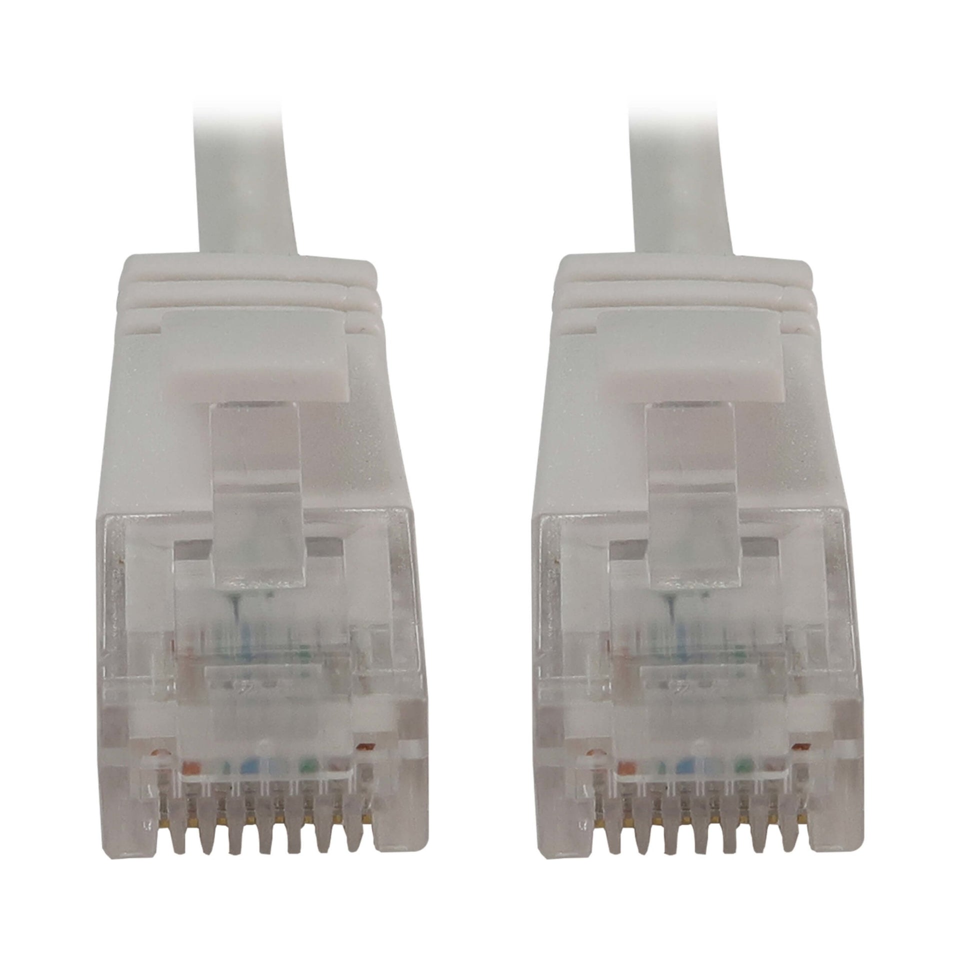 Cat6a Cable Ideal for Your High-Density 10 Gigabit Ethernet Network This Cat6a 10G Ethernet cable with RJ45 connectors is recommended for connecting network components like printers, computers, copiers, routers, servers, modems, hubs and switches in high-density data centers and network closets. Designed for fast transmission and excellent signal quality, the N261-S15-WH ensures peak performance throughout your LAN. Supports Power over Ethernet to Save You Money and Give You More Installation Choices Because this Cat6a cable supports PoE, it can supply the power to operate compatible PoE devices, such as security cameras, VoIP telephones, point-of-sale kiosks and access control devices. This saves you the expense and effort of purchasing, connecting and installing individual power supplies for each device. It also helps you install PoE devices in areas far away from AC outlets, such as poles or ceilings. Special Slim Design for Better Airflow and Easier Installation This Cat6a UTP patch cord is more than 38% smaller in diameter than standard Cat6a cable. This increases airflow in tight spaces, which helps keep your equipment cool and properly functioning. It also cuts down on clutter in crowded racks and patch panels, and makes the cable easier to install around corners and through cable management panels. Snagless RJ45 Male Connectors Add Extra Protection The RJ45 connectors’ snagless design protects the locking tabs from being damaged or broken off during installation. The contacts feature 50-micron gold plating to help ensure the most accurate signal transfer possible, improving near-end crosstalk (NEXT) performance to 500 MHz. White Jacket Helps Avoid Misidentification That Can Cause Costly Downtime The cable has a white PVC jacket, which is easy to identify quickly in a crowded patch panel or switch and helps prevent the cable from becoming accidentally disconnected. Premium Construction for Superior Performance Manufactured from 28 AWG copper wire, the four-pair stranded cable is rated for speeds up to 10 Gbps. Integral strain relief gives the unshielded cable extra flexibility, reduces stress and helps the cable move freely without cracking or breaking loose from the connector.