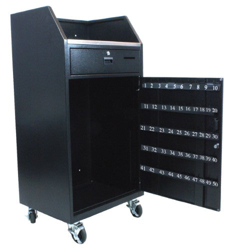 - 50 key capacity- Welded 12 gauge formed steel metal cabinet- Scratch-resistant textured black finish- Brushed stainless steel working surface- Key hooks with screen printed white numbers for easy reference- Zinc hardware- 1 1/2" Umbrella holder with locking knob (umbrella not included)- 4 locking, heavy duty, 4" casters provide easy mobility into and out of storage area- Constructed to easily accommodate your company's sign on the front or side panels- 2 slam action door/drawer locks with 2 keys to keep your items secure- Recessed door/drawer handles- Tip slot- Optional: Locking Tip Box (2 keys), Umbrella for umbrella holder