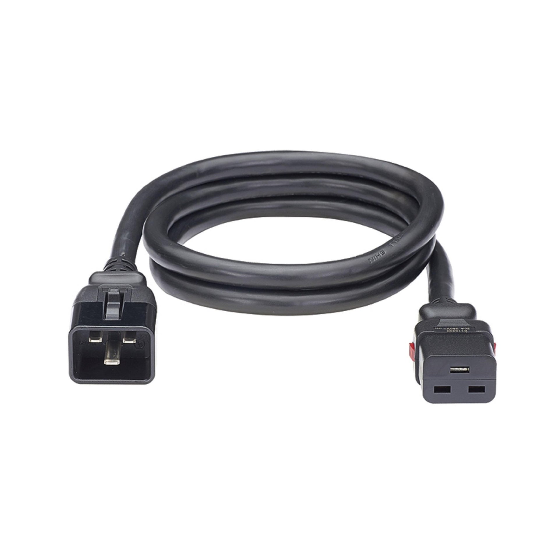 Locking Power Cord, IEC C20 to IEC C19 Heavy-duty dual locking power cord designed for effective power transfer from the Panduit G5 rack power distribution unit (PDU) to IT equipment. Their dual locking nature eliminates accidental disconnects caused by vibration and/or gravity. Compatible with W Lock & V Lock PDU outlets.