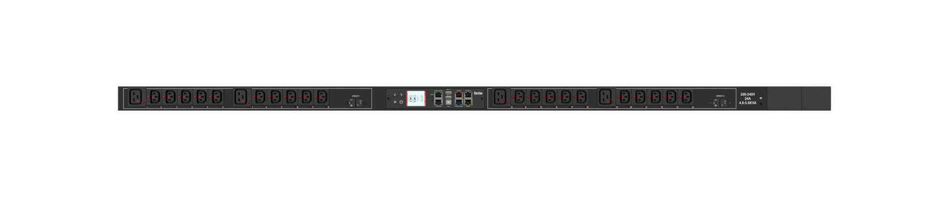 Monitored rack power distribution unit (0U [vertical], 5kVA, 24 outlets). INPUT: 208v, 24a - Hardwired [AC Terminal Block, No Cord]; OUTPUT: 20@ C13 Locking, 4@ C19 Locking outlets; on 2@ 2-pole, 20a Overcurrent Protectors; FEATURES: Billing-Grade (+/- 1%) Energy Metering [kW, kVA, V, A, Power Factor] - per inlet, per breaker/fuse, per outlet; Remote network monitoring via HTML, JSON-RPC, SSH, Telnet, MODBUS/TCP, and SNMPv3. Onboard embedded processor with minimum 536MHz clock speed, 16MB SPI Flash, and 64MB DDR2 RAM. Cascading upto 16 PDU's using single Ethernet or USB connection. Environmental monitoring [temp/humidity] capable up to 32 sensors. Individual outlet numbers labeled on chassis. Automated deployment via TFTP, DHCP, SSH(CLI), or USB Flash Drives. WiFi Capable. USB Webcam Capable. iPad/iPhone/Android App. Dual 10/100/1000 Ethernet port. Tri-color status LED per receptacle. Breaker metering and alarming (0V detection). Max Dimensions 52mm x 71mm x 1539mm (2.1in x 2.8in x 60.6in). Max Weight 5.9 kg. Maximum ambient temperature 60C at full load.