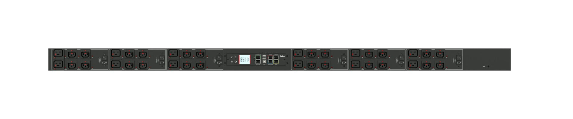 Monitored rack power distribution unit (0U [vertical], 14.4kVA, 36 outlets). INPUT: 208v (3-phase DELTA), 50a - CS8365C plug (3P4W); OUTPUT: 24@ C13 Locking, 12@ C19 Locking outlets; on 6@ 2-pole, 20a Overcurrent Protectors; FEATURES: Billing-Grade (+/- 1%) Energy Metering [kW, kVA, V, A, Power Factor] - per inlet, per breaker/fuse, per outlet; Remote network monitoring via HTML, JSON-RPC, SSH, Telnet, MODBUS/TCP, and SNMPv3. Onboard embedded processor with minimum 536MHz clock speed, 16MB SPI Flash, and 64MB DDR2 RAM. Cascading upto 16 PDU's using single Ethernet or USB connection. Environmental monitoring [temp/humidity] capable up to 32 sensors. Individual outlet numbers labeled on chassis. Automated deployment via TFTP, DHCP, SSH(CLI), or USB Flash Drives. WiFi Capable. USB Webcam Capable. iPad/iPhone/Android App. Dual 10/100/1000 Ethernet port. Tri-color status LED per receptacle. Breaker metering and alarming (0V detection). Max Dimensions 79mm x 89mm x 1650mm (3.1in x 3.5in x 65.0in). Max Weight TBD. Maximum ambient temperature 60C at full load.