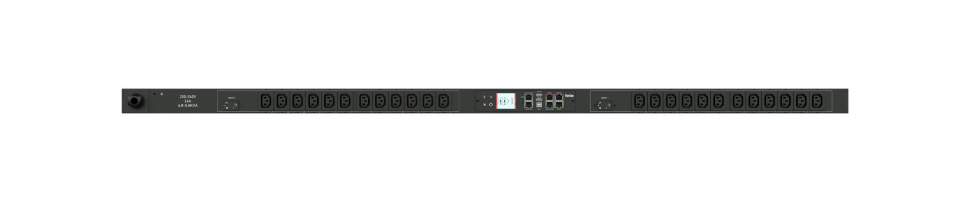Monitored and switched rack power distribution unit (0U [vertical], 5kVA, 24 outlets). INPUT: 208v, 30a - NEMA L6-30P plug (2P3W); OUTPUT: 24@ C13 outlets; on 2@ 2-pole, 20a Overcurrent Protectors; FEATURES: Billing-Grade (+/- 1%) Energy Metering [kW, kVA, V, A, Power Factor] - per inlet, per breaker/fuse, per outlet; Remote network monitoring via HTML, JSON-RPC, SSH, Telnet, MODBUS/TCP, and SNMPv3. Onboard embedded processor with minimum 536MHz clock speed, 16MB SPI Flash, and 64MB DDR2 RAM. Cascading upto 16 PDU's using single Ethernet or USB connection. Environmental monitoring [temp/humidity] capable up to 32 sensors. Individual outlet numbers labeled on chassis. Automated deployment via TFTP, DHCP, SSH(CLI), or USB Flash Drives. WiFi Capable. USB Webcam Capable. iPad/iPhone/Android App. Dual 10/100/1000 Ethernet port. Tri-color status LED per receptacle. Breaker metering and alarming (0V detection). Max Dimensions 52mm x 65mm x 1539mm (2.1in x 2.6in x 60.6in). Max Weight TBD. Maximum ambient temperature 60C at full load.