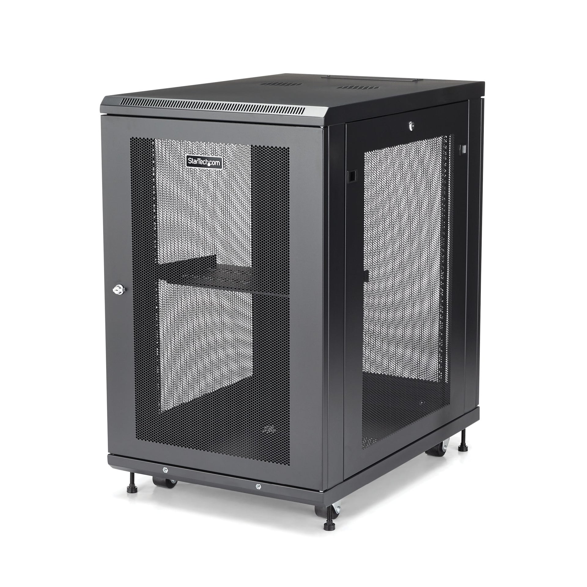 Securely store servers, network and telecommunications equipment in this 18U server or network cabinetThis server rack provides 18U of storage space in a sleek, secure cabinet for storing standard 19†rack-mount devices such as Dell, HP, and IBM servers, along with telecommunication and A/V equipment. The rack is compatible with EIA-310 compliant equipment and supports a total load capacity of 450 kg (992 lb.).Hassle-free equipment installationThis rack includes a variety of features that enable you to easily incorporate plenty of equipment. With adjustable mounting rails, you can easily change the rail depth from 2" up to 30" (76.2 mm - 780 mm) to ensure compatibility your standard rack-mount equipment. The added depth also provides support for additional cable and power management behind your equipment. For hassle-free cable management, the rack includes a 3 meter roll of hook-and-loop cable tie that makes it easy to keep your cables neat and tidy by binding them together or binding them to the rack. The self-gripping fabric can be cut to any size, enabling a wrap-around solution for the cables of any rack-mount equipment.The rack features holes with covers on the ceiling and floor panels that make it easy to run cabling to the inside and outside of the cabinet, for discreet cable management. The rack also features grounding lugs that enable you to ground your equipment for added protection. This rack also includes a 1U shelf that gives you a stable surface for placing equipment that's not rack-mountable or storing your tools.To provide hassle-free deployment the rack ships fully assembled.Securely protect your equipmentTo keep your rack-mounted equipment secure, this rack features front and rear locking mesh doors. The mesh doors look great in any server room and help provide passive cooling. The doors are also reversible, which gives you the freedom to choose which side of the rack the door opens from, to suit your server room’s spatial requirements.The rack also has removable side panels with independent quick-release locks that enable you to access your equipment easily, while still keeping it secure.Maximum Maneuverability, with casters includedThe cabinet features casters for hassle-free access to rear-mounted equipment while providing ease of mobility around your office, studio or server room. Plus, the width and height of the rack fit through standard doorways, giving you the freedom to wheel your server rack into different rooms.The RK1833BKM is backed by a StarTech.com 5-year warranty and free lifetime technical support.The StarTech.com Advantage