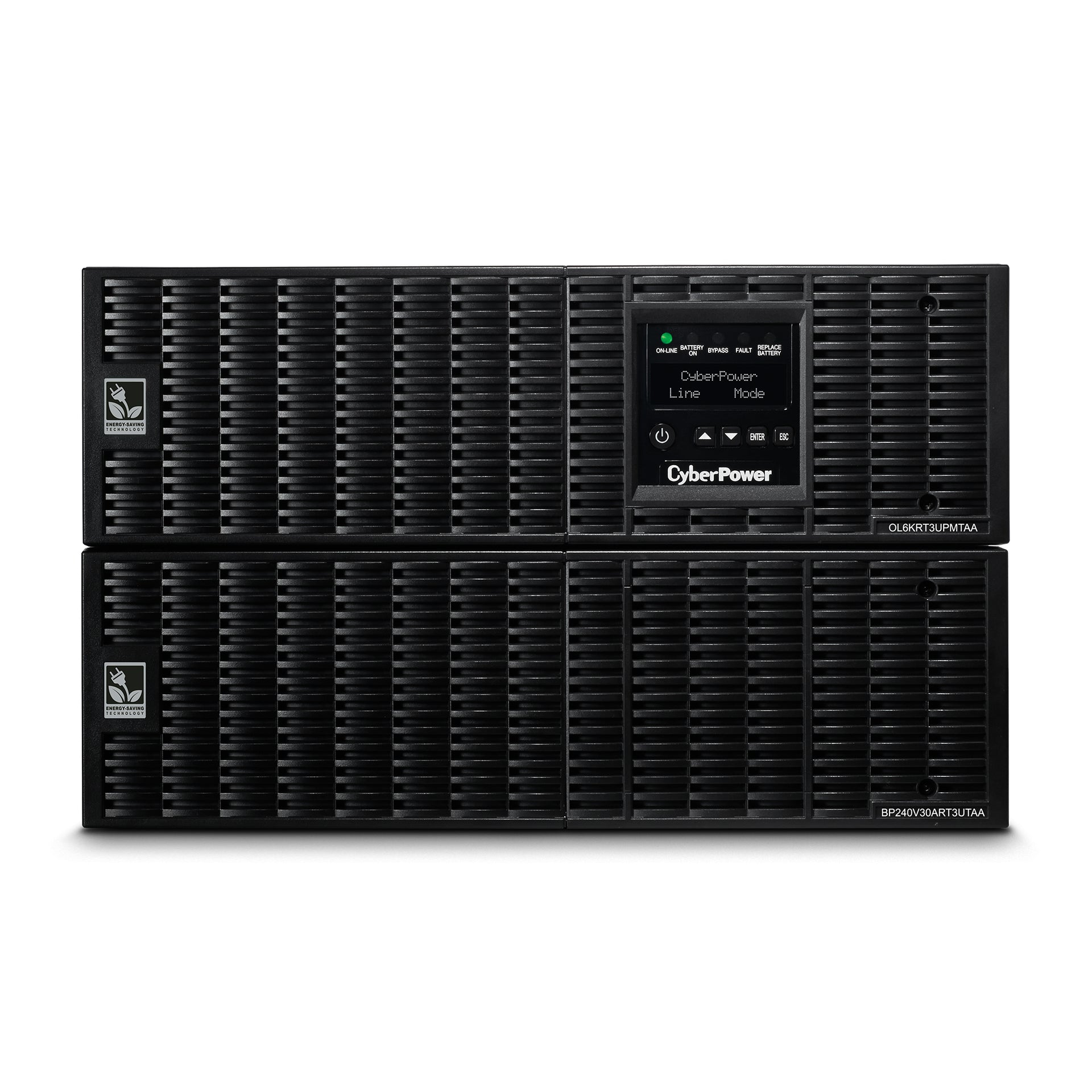 The CyberPower Smart App Online OL6000RT3UTAA UPS has been manufactured to comply with the Federal Trade Agreement Act (TAA). This network-grade UPS protects mission-critical servers, routers and telecom equipment with true sine wave output and double-conversion topology for seamless power protection. The OL6000RT3UTAA also offers generator compatibility and delivers clean AC power with zero transfer time. Other features include a flexible rack/tower design for easy installation, extendable LCD control panel, Smart Battery Management, Fast Charge Technology, and energy-saving GreenPower UPS ECO Mode. The CyberPower OL6000RT3UTAA UPS is protected by a three-year warranty as well as a $300,000 Connected Equipment Guarantee. Data Line Protection Prevents power surges that travel through telephone and Ethernet lines from causing damage to electronics. Double-Conversion Topology Provides consistent, clean, and nearly perfect power, regardless of the condition of incoming power. Systems with this technology operate on isolated DC power 100% of the time and have a zero transfer time because they never need to switch to battery. Double-conversion UPS systems are designed for high-end system components, corporate servers, lab equipment, and other sensitive electronic devices. Sine Wave Output Provides power protection to ENERGY STAR 6.0 systems with Active PFC power supplies. Extendable LCD Panel Displays UPS statuses and customizable operating settings from up to 10 ft. away (with optional cable). The extendable LCD control panel can be configured in English, Spanish, or French for ease of use. Extended Battery Module (EBM) Extends runtime by adding EBMs. This UPS allows for up to ten added modules. Fast Charge Technology Allows UPS batteries to return to 100% capacity more rapidly by utilizing a built-in charger inside each EBM. Restores a complete charge within 5 hours regardless of the number of EBMs. Smart Battery Management (SBM) Improves and extends the functional life of a UPS battery and reduces excessive heat during work cycles by using a three-cycle charging process. GreenPower UPS ECO Mode Improves UPS efficiency up to 96%; saves on electrical and cooling costs. Hot-Swappable Batteries Eliminate downtime related to UPS power maintenance for continuous power availability. Critical & Non-Critical Loads The UPS has two banks of outlets which can be configured so that the non-critical loads shut off after a set timeframe to provide additional runtime for the critical load outlet. Users can prioritize their equipment runtimes to maximize the output of the UPS to meet their power requirements. Emergency Power Off (EPO) Allows the UPS to be shut off in the event of an emergency, when the EPO port is connected to an EPO switch. Backfeed Protection Prevents the risk of electric shock from any electric current feeding back from the UPS through the input terminals when utility power is lost. Backfeed protection isolates the UPS and allows service personnel to safely work on the utility power. Generator Compatible Provides stable sine wave output (free of harmonics and distortion) without switching to battery mode when running on generator input power. Converter Mode Provides the flexibility to set the output frequency, regardless of the input frequency, to match connected equipment by selecting 50Hz or 60Hz output on the LCD control panel. USB & Serial Connectivity Enables full integration with built-in power management and auto shutdown features on Windows, Linux, and VMware systems through a HID-compliant USB port and Serial port. EMI/RFI Filters Prevent electromagnetic and radio frequency interference to ensure clean power for connected equipment. Audible Alarms Identify when the model is running on battery power, overloaded, or has a low battery. Resettable Circuit Breaker Interrupts an electric current in a circuit when the current becomes too high. LED Status Lights Indicate Power On, Line Mode, Battery Mode, Bypass Mode, Fault, Replace Battery. Rack/Tower Versatility Allows for horizontal rack or vertical tower installation. PowerPanel Business Edition Software Provides IT professionals with tools for monitoring and managing the UPS and backup power. This software offers remote management functionality. Free software download available. See the Resources tab. Cisco Compatible This CyberPower UPS system is a Cisco EnergyWise compliant end device. ENERGY STAR This model is an ENERGY STAR certified Uninterruptible Power Supply (UPS) system. ENERGY STAR is the trusted, government-backed symbol for energy-efficient products and practices that help save money and protect the environment. Three-Year Warranty CyberPower will repair or replace a defective UPS system (including batteries) within three years of the purchase date. See warranty for details. Connected Equipment Guarantee CyberPower will repair or replace properly connected equipment if it is damaged by a power surge.