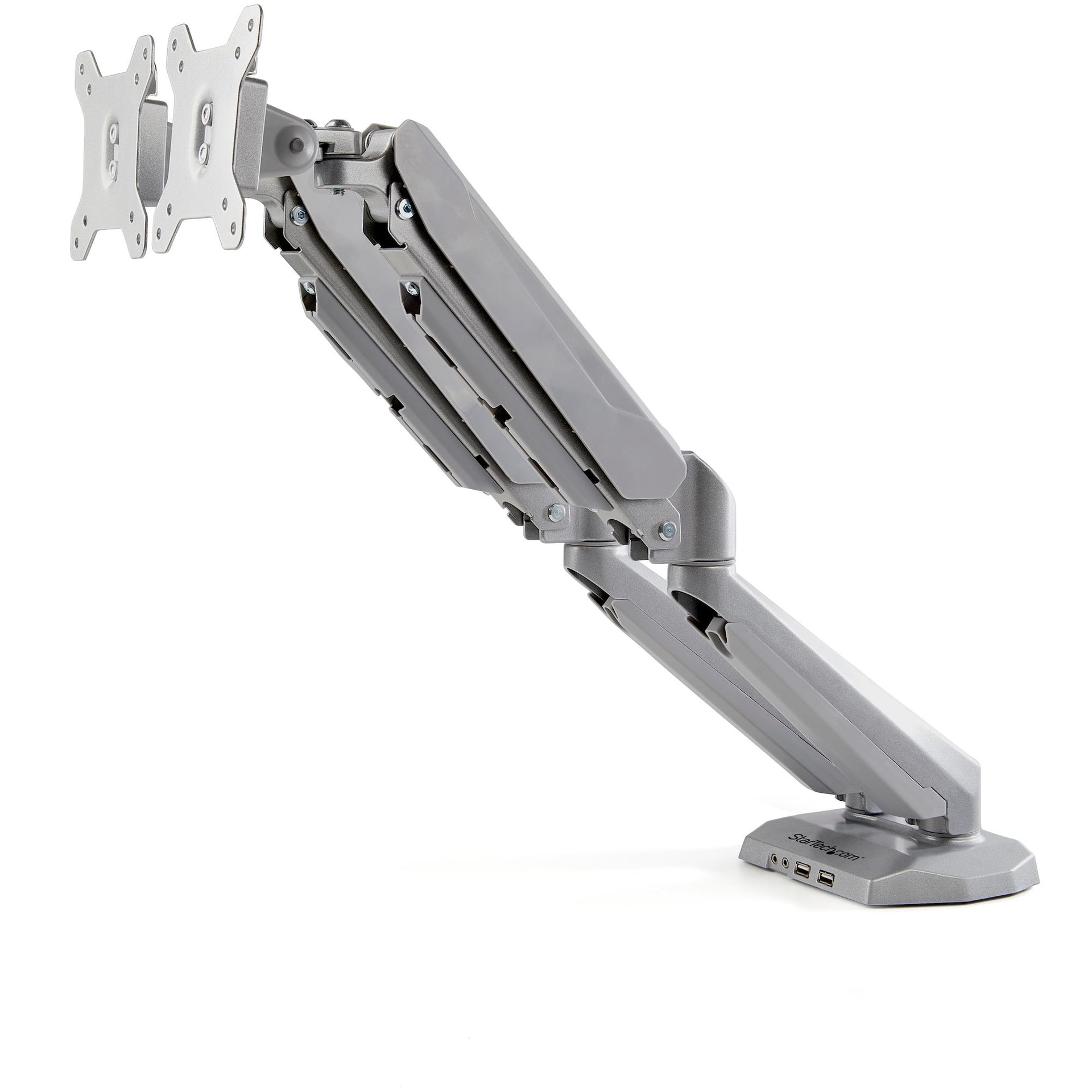 The desk-mount monitor arms offer a full range of motion on several axes, letting you tilt, pan and rotate your monitors to adjust your viewing angle. The dual-arm monitor mount holds two 15†to 32†monitors and each arm supports up to 8.0 kg (17.6 lb.) of weight.