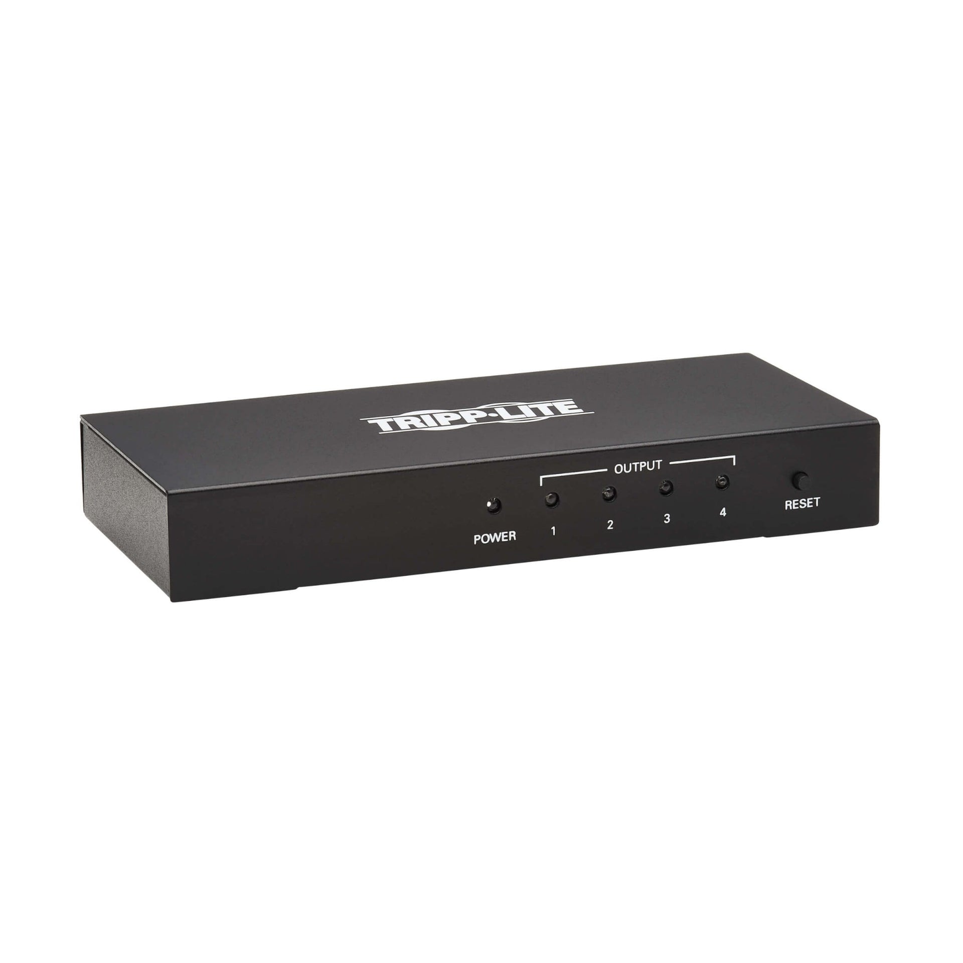 1x4 HDMI Splitter Transmits 4K Video + Audio to 4 HDMI Displays at the Same Time Recommended for home theaters or short-distance digital signage applications in classrooms, offices, restaurants, bars, hotels and trade shows, this Ultra HD splitter is quick and easy to install. It connects to an HDMI source device, such as a laptop, media server or Blu-ray player, and transmits a 4K audio/video signal to four HDMI monitors, projectors or televisions simultaneously. You can also cascade up to three levels of splitters to send the same 4K signal to as many as 64 displays. Transmits Crystal-Clear 4K Video and Multi-Channel Audio up to 40 ft. (12 m) The B118-004-UHDINT supports Ultra HD video resolutions up to 3840 x 2160 at 30 Hz with 36-bit Deep Color (12 bits per channel). Place the splitter up to 16.4 feet (5 meters) from an HDMI source and up to 23 feet (7 meters) from as many as four connected monitors for a maximum distance of approximately 40 feet (12 meters) from source to display. The B118-004-UHDINT also supports DTS-HD, Dolby TrueHD, Dolby Digital Plus and LPCM 7.1-channel surround sound. Also Compatible with DVI Video Sources and Displays To avoid an expensive upgrade to HDMI equipment, you can connect legacy DVI-D single-link sources and displays to the B118-004-UHDINT by adding an HDMI-to-DVI adapter, such as Tripp Lite’s P566-Series (sold separately), to your application. Note: You will be able to transmit video only – no audio. Resolutions will be limited to those supported by the adapter. Ready to Use Right Out of the Package The plug-and-play HDMI splitter requires no software to download and install. Connect the HDMI input to the source and the four HDMI outputs to displays with user-supplied HDMI cables, such as Tripp Lite’s P568-Series (sold separately). The included external power supply comes with four international plug adapters that allow you to use the B118-004-UHDINT almost anywhere in the world.