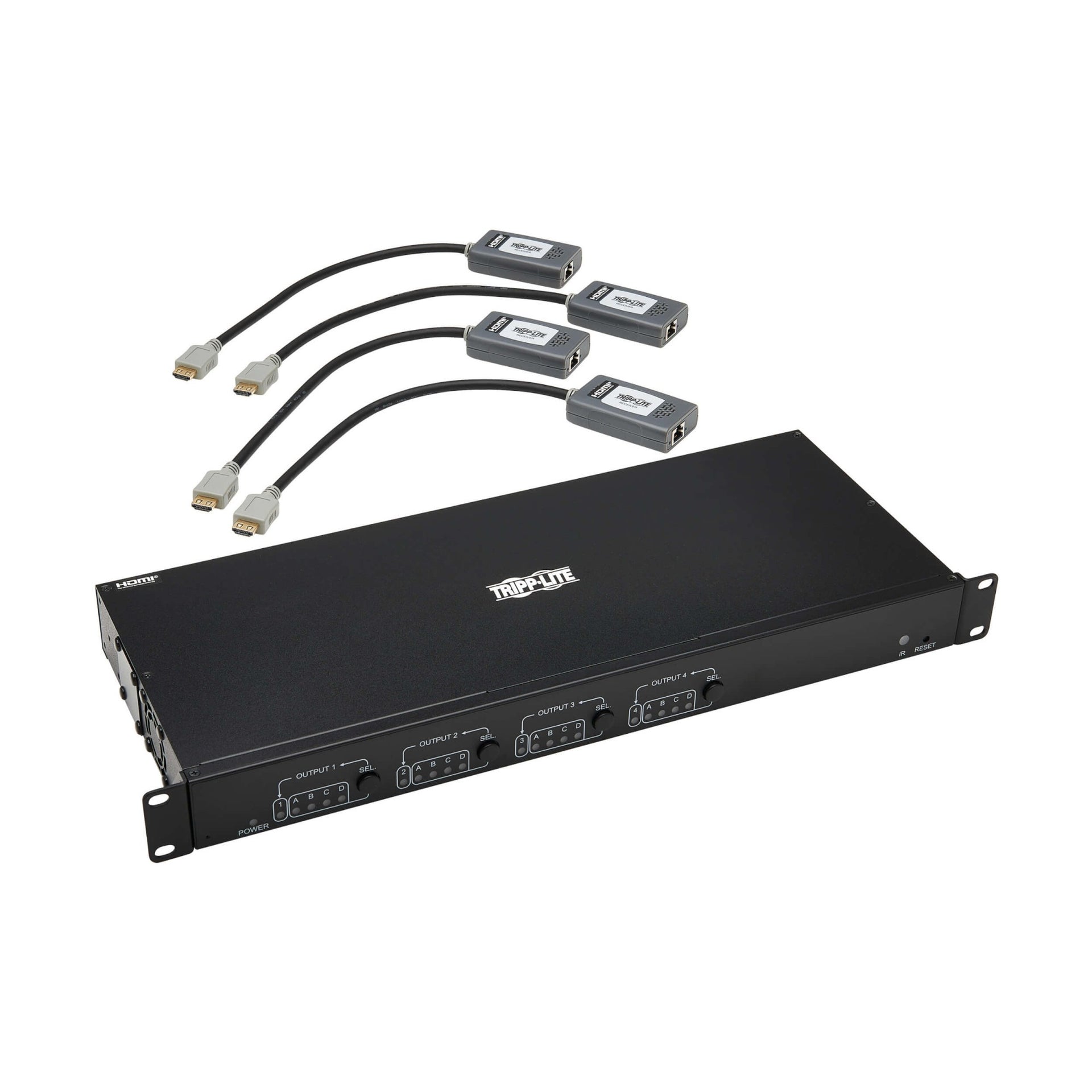 HDMI Matrix Switch Kit Ideal for Digital Signage in Offices, Schools and Trade Shows This HDMI matrix switch kit includes a quad-input switch and four pigtail-style receivers. It’s recommended for office buildings, schools, houses of worship, trade shows, meeting facilities, retail settings, hotels and other locations with video presentations or digital signage applications. The matrix switch and receivers extend 4K audio/video up to 230 feet (70.1 meters), making the kit ideal for areas where the four source devices and four remote displays are farther apart than conventional cabling allows. Extends a 4K A/V Transmission up to 230 ft....or Even Farther The B127A-4X4-BH4PH allows video from any of four connected HDMI sources to display on four HDMI displays up to 230 feet away via user-supplied Cat6 cabling. You may select which video to display on which monitors by using the push button on the switch or the included IR remote control, which lets you operate the switch from the receiver end of the installation. By installing Tripp Lite B127A-010-H signal repeaters (sold separately) between the switch and receivers, you can extend the signal up to 400 feet (121.9 meters) total per video output. Transmits Crystal-Clear 4K Video with Multi-Channel Audio, HDR and 4:4:4 Color The B127A-4X4-BH4PH supports Ultra HD resolutions up to 3840 x 2160 (4K x 2K) at 60 Hz, as specified in HDMI 2.0, with 36-bit Deep Color. High Dynamic Range (HDR) provides a wide range of vibrant colors with richer contrast, brighter whites and deeper blacks that pop on your 4K display. HDCP 2.2 compliance allows you to stream 4K Amazon and Netflix content with no complications. This switch kit also supports 4:4:4 chroma subsampling for top-level PC gaming or using your HDTV as a PC monitor. Built-In PoC Technology Provides Power to Avoid Bulky External Power Bricks After you connect the included external power supply to the switch, Power over Cable (PoC) technology powers the receivers over Cat6 cable. LEDs on both the switch and receivers will light up to indicate the system is receiving power and a signal is being transmitted. PoC lets you avoid the hassle of a bulky power brick and gives you the freedom to place the receivers without the need for a nearby AC outlet. Multi-Resolution Support Allows Mixing and Matching of Displays of Different Resolutions Say you have a brand new 4K/60 Hz HDTV in the living room, but want to extend video from the source devices to the older 1080p TV in the kitchen and the 4K (at 30 Hz) monitor in your home office. The B127A-4X4-BH4PH is backward compatible with 4K/30 Hz and 1080p resolutions via automatic switching, allowing each connected monitor to display video at its maximum resolution. Plug-and-Play Operation for Quick Setup and Immediate Use The included matrix switch and receivers operate with no software required. The switch comes with detachable surface-mount brackets for mounting to a pole, rack or flat surface. Connect the switch to as many as four sources with user-supplied HDMI cables (such as Tripp Lite’s P568- or P569-Series). Then, connect the pigtail receivers’ built-in HDMI plugs to the displays. Finally, connect the switch to the receivers with user-supplied Cat6 patch cable (such as Tripp Lite N202-Series). TAA-Compliant for GSA Schedule Purchases The B127A-4X4-BH4PH is compliant with the Federal Trade Agreements Act (TAA), which makes it eligible for GSA (General Services Administration) Schedule and other federal procurement contracts.