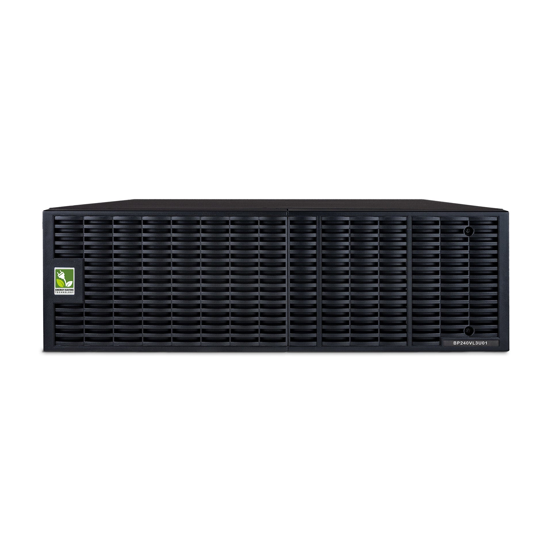 The CyberPower BP240VL3U01 rack/tower convertible Extended Battery Module (EBM) extends UPS runtimes during power outages. Designed for select Smart App Online UPS systems, this EBM takes 3U of rack space and can be installed in a rack or tower configuration to match the UPS form factor. It also has a built-in battery charger, providing Fast Charge Technology to quickly restore the backup power supply from 0-90% in four hours. Up to ten EBMs can be connected in a daisy-chain to the UPS. The BP240VL3U01 typically has a UPS charging time of four hours regardless of whether one or ten EBMs are installed when Fast Charge is connected. The BP240VL3U01 is compatible with OL6KRT, OL6KRTF, OL8KRT, OL8KRTF, OL10KRT, OL10KRTF, and OL10KRTHW. With a three-year warranty, you can trust CyberPower’s commitment to the quality of the BP240VL3U01. Extended Battery Module Extends runtime and restores full backup power quickly with Fast Charge Technology. Hot-Swappable Batteries Can be replaced without powering down vital equipment. Fast Charge Technology Uses a built-in battery charger in each EBM for quick charging, regardless of the number of EBMs attached to a UPS. Smart Battery Management Uses the UPS three-cycle charging mode that improves battery life and reduces generated heat. Plug-and-Play DC Connectors Allows for daisy-chaining additional EBMs to a UPS system. Resettable AC Fast Charge Circuit Breaker Resets the EBM swiftly in case of an overload. Rack/Tower Configuration Allows for horizontal rackmount or vertical tower installation.