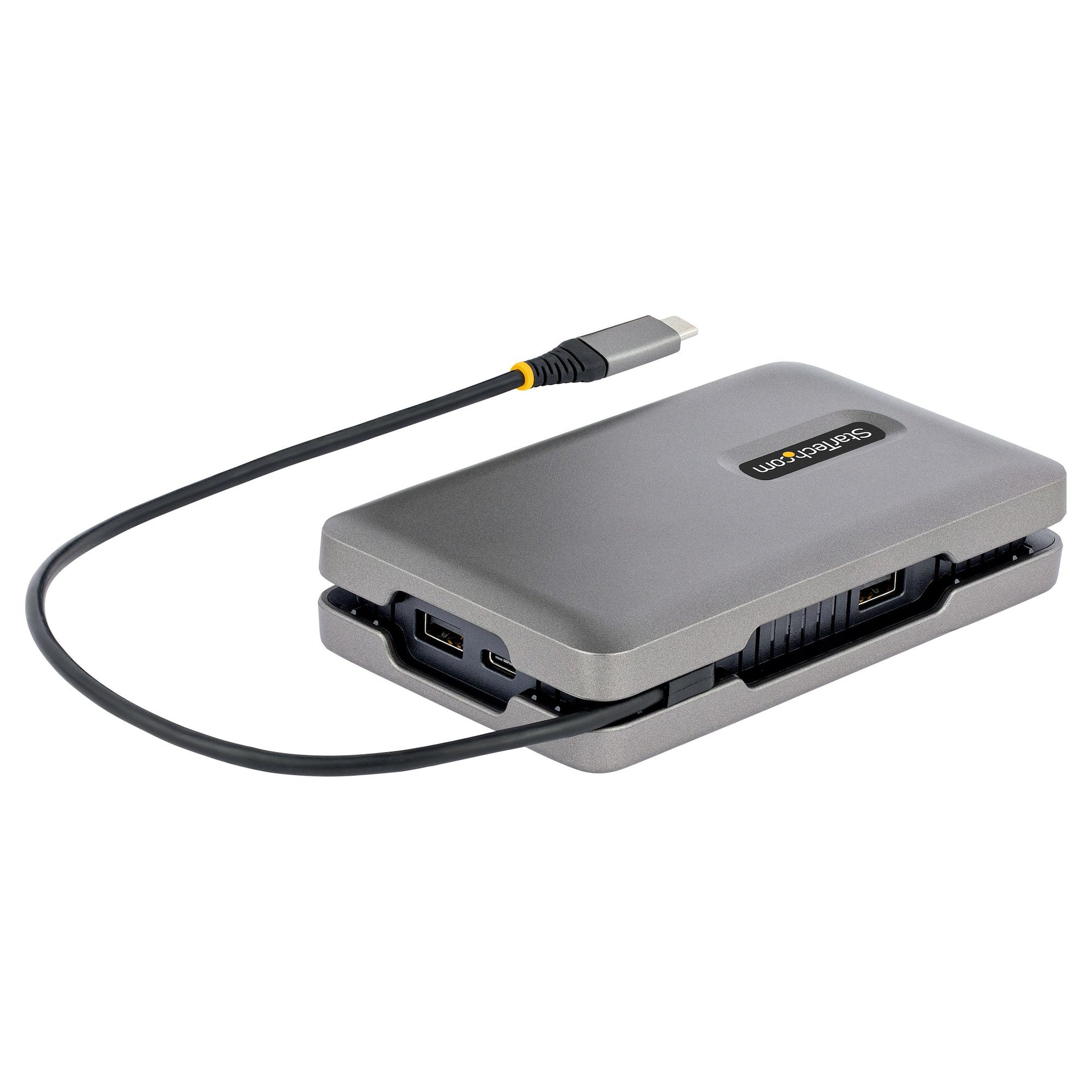 This USB-Câ„¢ Multiport Adapter/Docking Station with DisplayPortâ„¢ 1.4 (Alt Mode) and Multi-Stream Transport (MST), features three video output options (HDMI, VGA and USB-C video) to support a single or multi-monitor workstation. The USB-C video port supports USB 3.2 Gen 2 (10Gbps) with 10W of power, to connect a USB-C monitor or a USB-C peripheral. In addition, the Docking Station also features a 2-Port USB-A 3.2 Gen 2 (10 Gbps) Hub, a Gigabit Ethernet port, and providing advanced charging through a USB Power Delivery (PD) 3.0 pass-through port. The Multiport Adapter connects to a laptop's USB-C or Thunderbolt 3/4â„¢ port, using the integrated 10-inch (25cm) USB-C cable. Versatile, High-Performance Video via MST The compact USB Type-C Docking Station features three video output options to turn your laptop into a single or multi-monitor workstation. HDMI Port Provides HDR video with resolutions up to 4K 60Hz. VGA Port Provides analog video with resolutions up to 1080p 60Hz. USB-C Port Provides the industry's first downstream full featured video or data (10Gbps) USB-C port that supports DP Alt Mode video or peripheral connection, on a non-Thunderbolt adapter. The advanced video versatility of this Multiport Adapter, makes it suitable for a wide variety of applications: - Connect a portable USB-C monitor as an extended display, to obtain a high resolution external monitor during on-the-go travel between an office desk, home office, hot desk, or the boardroom. - Connect a USB-C peripheral to the downstream 10Gbps USB-C port, while using the HDMI and/or VGA ports to connect external monitor(s) as extended display(s). - Connect multiple external monitors as extended displays, using any combination of the two video ports, to create a high-productivity workstation. USB-C video adapters (sold separately) can be used to connect HDMI, DVI, VGA, or DisplayPort monitors to the USB-C video port. Connect Your Devices The USB 3.2 Gen 2 (10Gbps) hub features two USB-A ports and one USB-C port, for connecting your USB devices. The downstream USB-C port can be used to connect a monitor, or USB-C peripheral with up to 10W (5V/2A) of power, to power or charge your peripherals. Multiple Use Cases A versatile docking solution for use at an office desk, home office, hot desk, or in the boardroom. It's portable enough to be carried in a bag / backpack for mobile use. The USB-C dock can operate with bus-power alone, or with a USB-C power adapter connected to the USB Power Delivery pass-through port - for full laptop and USB-C peripheral charging. The lightweight docking station features a built-in 10 in (25 cm) USB-C host cable for added setup flexibility and to reduce port strain with laptop connection elevated off desktop surface. Charge Your Laptop and Peripherals With support for USB PD 3.0 (100W - 80W charging, 20W reserved for multiport adapter), the Multiport Adapter enables charging of the host computer and peripherals connected to the USB-C port. USB PD is only available when a USB-C power adapter is connected to the PD pass-through port. PD 3.0 features Fast Role Swap (FRS) which prevents USB data disruption when switching power sources (e.g., USB-C power adapter to bus power). Reliable Network Connectivity The Gigabit Ethernet port ensures reliable wired network access. Support for Wake-on-LAN (WoL) enables remote booting of the host computer. Enhance Productivity and Device Management with the StarTech.com Connectivity Tools Application Developed to improve performance and security, StarTech.com Connectivity Tools is the only software suite on the market that works with a wide range of IT connectivity accessories. The software suite includes: - Advanced Windows Layout Utility: Setup and save custom windows layouts. - MAC Address Pass-Through Utility: Improve network security. - USB Event Monitoring Utility: Track and log connected USB devices. - Wi-Fi Auto Switch Utility: Enable users to quickly access faster network speeds via wired LAN.