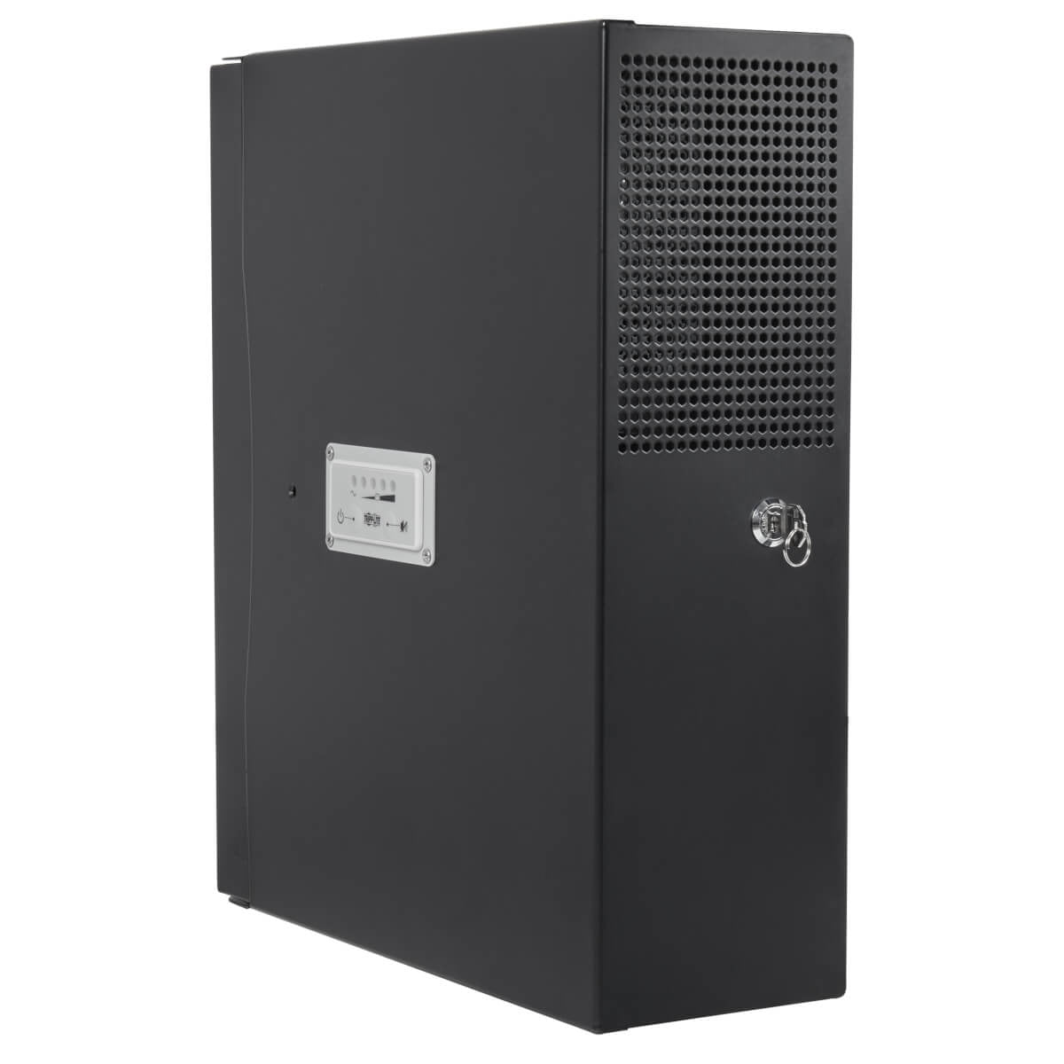 Provides power to your mobile television, monitor or interactive display, allowing teams to work together no matter where members may be. 110V Battery with Battery Box Allows Mobile Presentations at Work or School This 110-volt rechargeable battery system attaches to Tripp Lite’s DMCS3270XP and DMCS60100XX rolling TV stands, so you can move your television, monitor or interactive display from one room to another without the need for external power. Bring your message straight to your audience in a location where audio/video resources are shared. It’s ideal for classrooms, libraries, conference rooms, meeting rooms and other office environments in education, corporate, healthcare, hospitality, retail, government, defense and public safety settings. No Need to Limit Your Presentations to Areas Where Wall Outlets Are Convenient The DMBB110V helps you encourage and assist group collaboration and audience participation. The enclosed, rechargeable lithium iron phosphate (LiFePO4) battery system powers the connected display for up to 90 minutes or more without being plugged into a wall outlet. This allows you to give your presentations in areas where no outlets are present or are too far away. LEDs monitor battery charge level in real time. Plug the six-foot power cord into a standard AC outlet to charge the battery when not in use. Note: Runtime varies with wattage of connected equipment: approximately 220 min. at 100W, 100 min. at 220W, 75 min. at 300W and 50 min. at 420W. Included Battery Box Keeps Your System Safe The rechargeable battery system is enclosed within a lockable steel box that attaches to your display’s mobile cart and protects the system against damage, theft or tampering.