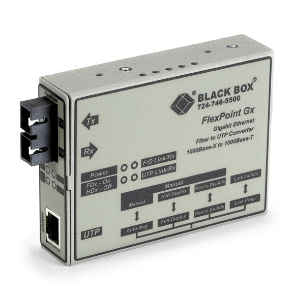 Extend your Gigabit Ethernet network up to 10 kilometers over fiber. - Easy installation and transparent operation—no software required. - Convert your copper Gigabit Ethernet network to fiber. - Supports IEEE 802.3ab 1000BASE-T and 1000BASE-LX standards. - Both UTP and fiber ports support full- and half-duplex operation. - Sends data up to 10 kilometers (6.2 mi.) on single-mode fiber. - Manual switches give you the option to control port operation. - Diagnostic LEDs report power availability and status of attached devices. - Hardware available for mounting the converter to a wall or a DIN rail. - Can also be used in the FlexPoint 14-Slot Power Chassis or the FlexPoint 5-Position Rackmount Kit. This FlexPoint Modular Media Converter provides plug-and-play conversion from 1000-Mbps UTP to 1000-Mbps fiber. FlexPoint™ Converters from Black Box are versatile and cost-effective standalone converters that you can upgrade to a chassis-based system. They provide the ultimate in flexibility and reliability for your expanding multimedia LAN. The incredible variety and versatility of this system make it ideal for networks that are subject to constant upgrades and changes. Tailor the system to your requirements. Get the converters you need now and use them individually. Then, when your LAN grows, mount your converters on the wall, in the FlexPoint 5-Position Rackmounting Kit, or in the FlexPoint Power Chassis. The chassis holds 14 converters and single or dual AC or DC power supplies.