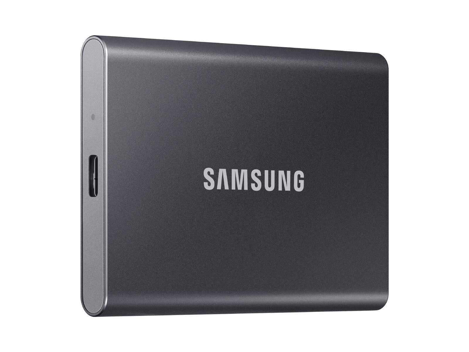 Portable storage, on the go The light, pocket-sized Portable SSD T7 delivers fast speeds with easy and reliable data storage for transfering large files. Whether you're storing critical business documents, games, or movies, the Portable SSD T7 gives you speed and durability in a palm-sized package. Introducing the new standard in external storage, available in three capacities to suit your needs: 500GB, 1TB, or 2TB. Transfer in a flash Transfer massive files within seconds with the incredible speed of USB 3.2 Gen 2 on the T7. The embedded PCIe NVMe technology delivers blazing fast sequential read/write speeds of up to 1,050/1,000 MB/s, respectively, making the T7 almost twice as fast as the previous T5 model. Built strong and secure Unlike HDDs, the Portable SSD T7 has no moving parts so it's more resistant to shock. Plus, its solid aluminum unibody construction adds further protection, keeping your data safe from falls of up to 6 ft. The T7 is confidently backed by a 3-year limited warranty. Advanced heat control Use T7 without the worry of overheating. It's advanced thermal solution uses ePCM technology and Dynamic Thermal Guard to withstand and control heat, so the Portable SSD stays at an optimal temperature even at fast speeds. Sleek and compact style Roughly the size of a credit card and only weighing 2 ounces, the T7 fits comfortably in the palm of your hand and is light enough to take your files on the go. Find your best fit Pick a color from classic gray to striking blue and red, and choose from three capacities to fit what your lifestyle demands: 500 GB, 1TB, or 2TB. Simple setup The T7 comes embedded with software to help you set up a password to get the latest firmware updates for your PC, Mac, or Android mobile devices. You can also download the mobile app for Android smartphones and tablets. Multi-device compatibility The T7 is compatible with PC, Mac, Android devices, gaming consoles, and more. Included in the box are USB Type C-to-C and Type C-to-A cables for added convenience. World's #1 flash memory brand Experience the superior performance and reliability that you can only get from the world's number one brand for flash memory since 2002. All firmware and components, including Samsung's world-renowned DRAM and NAND, are produced in-house, allowing end-to-end integration for quality you can trust.