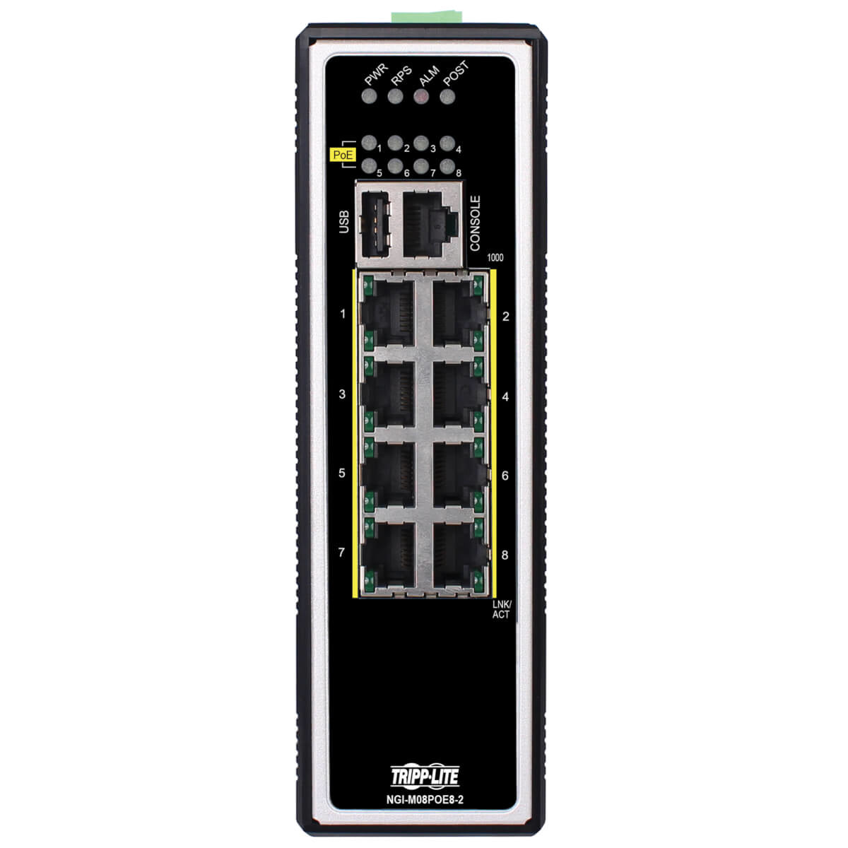 8-Port Managed Gigabit Ethernet Switch Connects Your Network Devices to a LAN This space-saving Tripp Lite switch transmits data over a Gigabit Ethernet network. Eight auto-negotiating 10/100/1000 Mbps ports send data via Cat5e/6/6a cable only to the devices designated to receive it, which improves the efficiency and potential throughput of the network. LEDs indicate when the NGI-M08POE8-L2 is powered on and which Ethernet ports are showing activity. PoE+ Ports Deliver Power to Devices Without Access to AC Outlets This managed switch features eight PoE ports capable of powering compatible PoE appliances and devices, such as VoIP phones and IP surveillance cameras, without the expense and effort of running separate power lines or installing the devices near an AC outlet. The NGI-M08POE8-L2 provides PoE+ compatibility up to 30W per port and a PoE budget of 120W with 24VDC input or 240W with 48VDC input to satisfy your demand for high-power network devices. Protective Metal Housing Built to Last in Harsh Environments The compact NGI-M08POE8-L2 adds 10/100/1000 Mbps Gigabit Ethernet capacity to industrial automation, government, military, oil and gas, mining, power/utility, security and water/wastewater applications, as well as other environments with space constraints and wide temperature ranges. The IP30 industrial-grade aluminum case withstands vibration, shock and free fall. It can also operate in extreme temperatures ranging from -40 to 75 degrees Celsius (-40 to 167 degrees Fahrenheit). Monitors and Controls Devices via CLI and Web Configuration The NGI-M08POE8-L2 supports MAC address auto-learning and auto-aging for efficient routing, as well as automatic MDI/MDI-X crossover detection for plug-and-play functionality. It also supports QoS, IGMP snooping and other device management features that fulfill the needs of high-performance managed industrial networks. IEEE 802.3x flow control allows smooth transmission of large files. The switch automatically shifts unused ports to an energy-saving state without interrupting network connection. Pre-Loaded with Standard Layer 2 Network Management Software This switch supports IGMP snooping in IPv4 to limit the flooding of multicast traffic by dynamically configuring Layer 2 interfaces. Multicast traffic is forwarded only to those interfaces associated with IP multicast devices. Works with the Most Popular Web Browsers The NGI-M08POE8-L2 is browser-based and works independently from the connected computer's operating system. Because switch compatibility is based on common hardware standards, rather than system software dependencies, the NGI-M08POE8-L2 accommodates most platforms. Preferred web browsers include Google Chrome (on both Windows and macOS) and Microsoft Edge (Windows only). Pre-Installed DIN Rail Clip Allows for Convenient Installation The switch may be DIN mounted using the pre-installed rail clip, which mounts firmly to any standard 35 mm DIN rail. Providing seamless operation in the event of power dips or failures, the switch features redundant 6-pin 24–57VDC terminal block power inputs to help prevent unnecessary downtime. When used with two power sources, the switch also supports alarm relay contacts that you can wire to your existing alarm circuit to notify you instantly when a power disruption occurs. TAA-Compliant for GSA Schedule Purchases The NGI-M08POE8-L2 is compliant with the Federal Trade Agreements Act (TAA), which makes it eligible for GSA (General Services Administration) Schedule and other federal procurement contracts.
