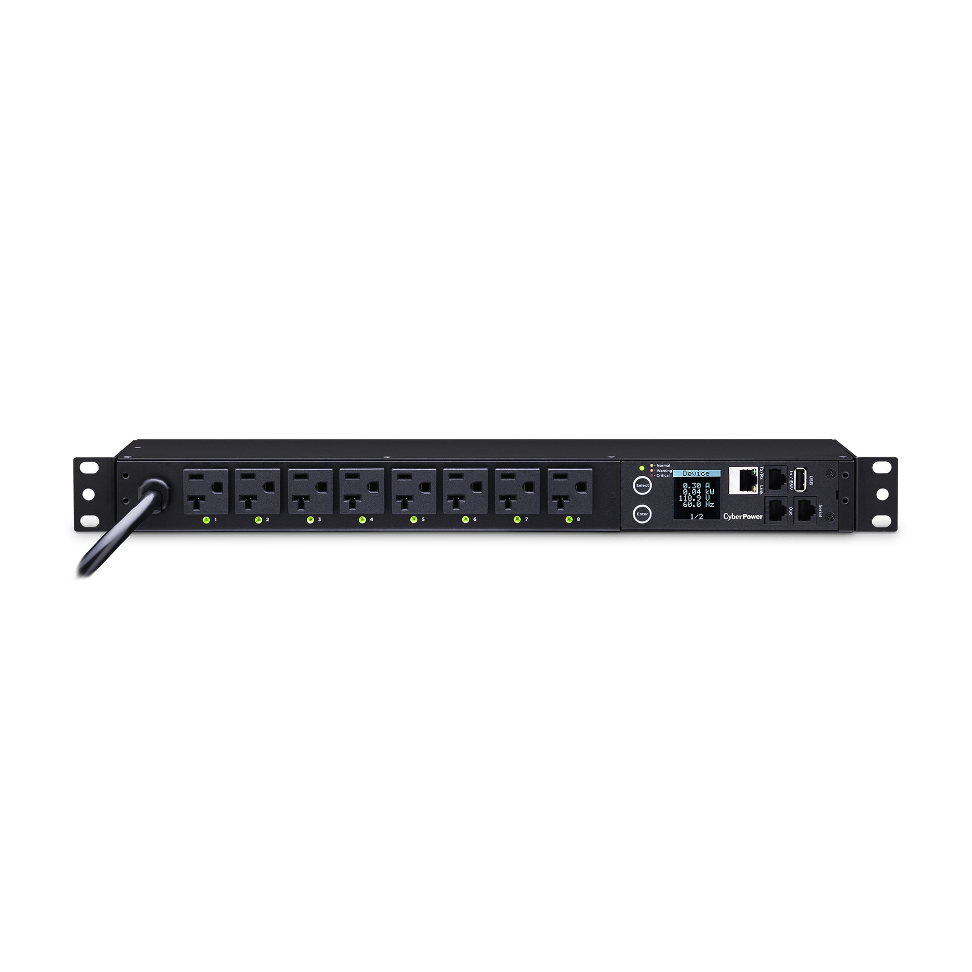 Product Overview The CyberPower PDU41002, an 8-outlet (front), 1U rackmount switched power distribution unit (PDU), provides 120V 20A output. It distributes power to 8 NEMA 5-20R receptacles from a single NEMA 5-20 or L5-20 (with adaptor) plug with unfiltered electrical pass-through. The switched outlet receptacles can be managed individually or collectively over the network, using the CyberPower Management Console, a web browser, and the RJ45 Ethernet port for network connection, or locally by using the LCD controls. Outlets can be turned on, turned off, or recycled on demand or at programmed times to address a number of needs including remote rebooting of locked equipment, load shedding, power sequencing, and locking out unauthorized loads. The PDU41002 comes with a three-year limited warranty that covers defects in materials and workmanship in the product under normal use and conditions within three years of the purchase date. Power Distribution Delivers AC power to servers, equipment, and connected devices via a power distribution unit. Switch-Free Design Safeguards against accidental power shutdown. Switchable Outlets Provides local and remote control for individual and multiple outlets. Local control: turn on/turn off outlets and disable unused outlets. Remote control: restart outlets and devices, turn on/turn off, schedule power on/off sequencing, and disable unused outlets. CyberPower Management Console A hardware interface built into Monitored and Switched PDUs. Its functionality includes the ability to switch PDU outlets on and off, reboot connected equipment locally or remotely, schedule power cycling of attached equipment, and perform other tasks, such as load monitoring and event logging. Remote and Local Monitoring Enables offsite and onsite tracking of PDU vitals; provides outlet control for individual and networked clients. Automatic Event Notifications Provide immediate updates about power events via email, SMS text, or SNMP traps. Upgradeable Firmware Downloadable improvements (firmware updates) to programs that run the PDU. Digital Display Provides easy-to-read information about amperage, voltage, KW, IP address, and other PDU information. Network-Grade Plugs and Outlets Highly durable construction ensures the efficient distribution of power in demanding IT or industrial environments to servers, equipment, and connected devices. Long Input Power Cord Reaches distant power sources, allowing the PDU to be placed where its needed. Cord Retention Tray Secures power cords, keeping them organized and accessible. Helps cords stay plugged in. Configurable Mounting Brackets Allow for installation of the PDU in the following configurations: 0U (vertical, under counter, and wall mount), 1U (horizontal, vertical, under counter, and wall mount), and 2U (horizontal and wall mount). Durable Metal Housing Protects internal components and resists damage from impact or abrasions within challenging industrial environments. Also extends the life of the product. Three-Year Limited Warranty Covers defects in materials and workmanship in the product under normal use and conditions within three years of the purchase date. See warranty for details.