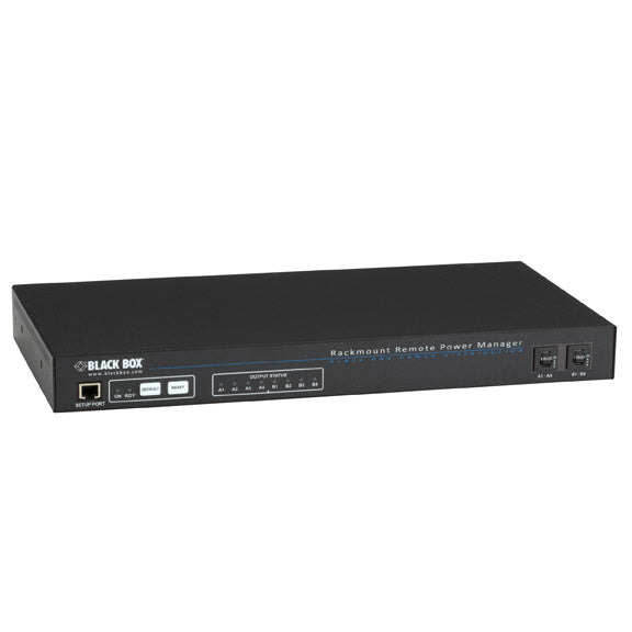 Convenient rackmount power control for up to eight remote network devices. Quick Facts - Enables you to reboot up to eight network devices from across your network, by modem, or across the Internet. - Reboot remote servers, routers, Web cams, firewalls, and other devices from your home or office. Further Details - Horizontal configuration. - Control devices via Telnet over a TCP/IP network, a Web browser and a modem, or serial commands. - Feature individually controllable outlet plugs. - Versions available for 105120-VAC, 100120-VAC, 100125-VAC, and 208240-VAC equipment. - Two levels of password protection and encrypted 64-bit password security. - Only authorized users can make configuration changes. - An RS-232 port is for modem or console connections. A 10BASE-T interface provides network connections. - Takes up only 1U or 2U of space. - Models with dual power circuits available. No more traveling to reboot your equipment in the middle of the night! No more service calls just to flip a switch! BLACK BOX® Rackmount Remote Power Managers enable you to reboot up to 16 network devices from across your network, by modem, with Telnet, or even from the Internet. Just type the power manager's IP address into your Web browser, enter your name and password, and you can access your network devices to switch them on, switch them off, or reboot. The power managers are perfect for remotely rebooting servers, routers, network switches, Web cams, firewalls, and many other network devices. The Web browser interface works across any TCP/IP network—even the Internet—with any JavaScript enabled Web browser. Its intuitive interface features easy-to-use menus. Control power by plug number or by name (such as ATM Switch 1, Gateway, Router 1, etc.) that you assign to each outlet. You can also operate the Horizontal Rackmount Remote Power Manager through an ASCII command line interface via Telnet™ over a TCP/IP network, through a modem connection, or from a local PC using a terminal emulator. Horizontal Rackmount Remote Power Managers have built-in password security to prevent unauthorized users from switching your devices or changing your configuration. Both the Web browser and the command-line interface use 64-bit encryption. Two levels of operational passwords provide an additional layer of security: System-level passwords provide access to all configuration and switching functions. The user level limits switching to assigned plugs and cannot be used to change the power manager configuration. Horizontal Rackmount Remote Power Managers feature an IP-addressed 10BASE-T interface for network connections and an RS-232 port for modem or console connections.