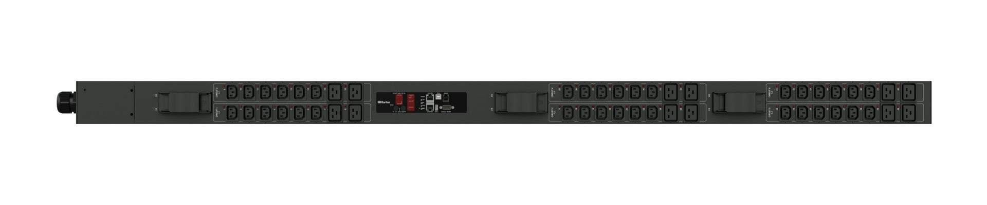 Monitored and switched rack power distribution unit (0U [vertical], 17.3kVA, 48 outlets). INPUT: 415v (3-phase WYE), 30a - NEMA L22-30P plug (4P5W); OUTPUT: 36@ C13, 12@ C19 outlets; on 6@ 1-pole, 20a Overcurrent Protectors; FEATURES: Billing-Grade (+/- 1%) Energy Metering [kW, kVA, V, A, Power Factor] - per inlet, per breaker/fuse; Remote Outlet Switching (Normally-Open Relays); 3-digit LED user-selectable display (voltage, current, or active power : per line or per breaker). Local display of alarms and configuration information(name, ratings, IP/Networking); Onboard embedded processor with minimum 400MHz clock speed, 16MB NOR Flash, and 64MB SDRAM; Remote network monitoring via HTML, JSON-RPC, SSH, Telnet, MODBUS/TCP, and SNMPv3. Environmental monitoring [temp/humidity] capable ñ up to 32 sensors. Individual outlet numbers labeled on chassis. Automated deployment via TFTP, DHCP/PXE, SSH(CLI), or USB Flash Drives. WiFi Capable. USB Webcam Capable. iPad/iPhone/Android App. Breaker metering and alarming (0V detection). Max Dimensions 89mm x 65mm x 1780mm (3.5in x 2.6in x 70.1in). Max Weight 11 kg. Maximum ambient temperature 60C at full load.
