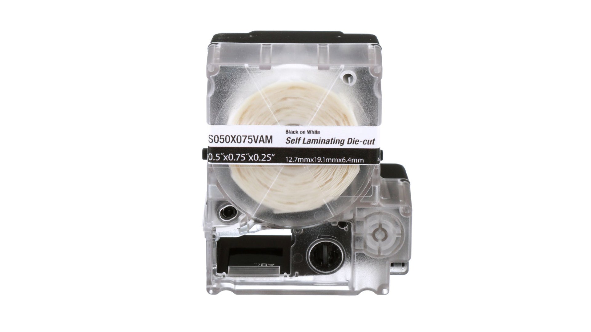 The S100X075VAM Die-Cut Self-Laminating Label Cassette includes both label material and ribbon for easy changeover. Self-laminating adhesive labels for wire/cable identification include a white print-on area and a clear overlaminate. For use with the MP300 printer. Vinyl. 0.50" x 0.75" (12.7 mm x 19.1 mm). Wire/Cable Size Range 18 -14 AWG. Color Clear/White. 300 labels per cassette. 1 cassette per package.