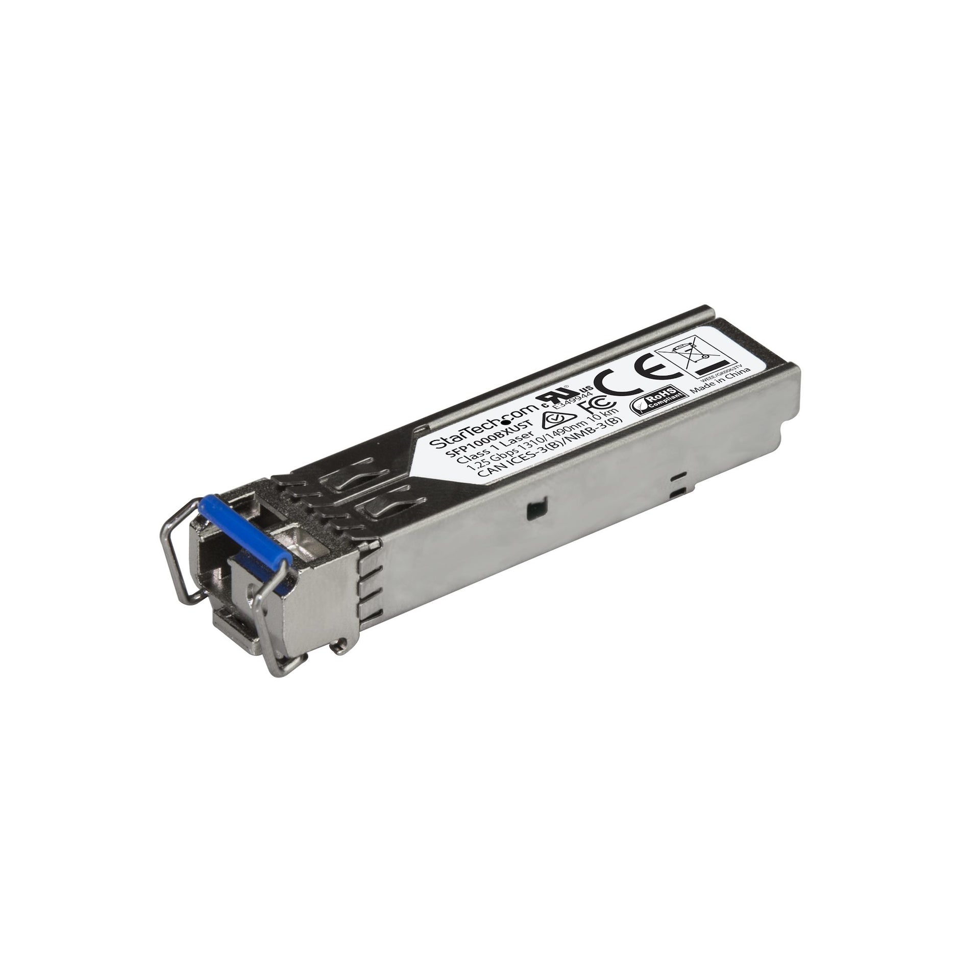 1000 Mbps (1 Gbps) | Single Mode Fiber | LC | 10 km (6.2 mi) | Lifetime WarrantyThe SFP1000BXUST is an MSA compliant upstream fiber SFP transceiver which pairs with StarTech.com's SFP1000BXDST. They are designed, programmed and tested to work with 1000BASE-BX compatible MSA switches and routers. The SFP transceiver module supports a maximum distance of up to 10 km (6.2 mi) and delivers dependable 1 GbE connectivity over fiber cabling.Technical Specifications:• Wavelength: 1310nmTx/1490nmRx• Maximum Data Transfer Rate: 1.25 Gbps• Type: Single Mode Fiber• Connection Type: LC Connector• Maximum Transfer Distance: 10 km (6.2 mi)• Power Consumption: Less than 1 Watt• DDM: YesThis SFP fiber module is hot-swappable, making upgrades and replacements seamless by minimizing network disruptions.StarTech.com SFPsAll StarTech.com SFP & SFP+ transceiver modules are backed by a lifetime warranty and free lifetime multilingual technical support. StarTech.com offers a wide variety of SFP modules and direct-attach SFP Cables, providing the convenience and reliability you need to ensure dependable network performance.The StarTech.com Advantage