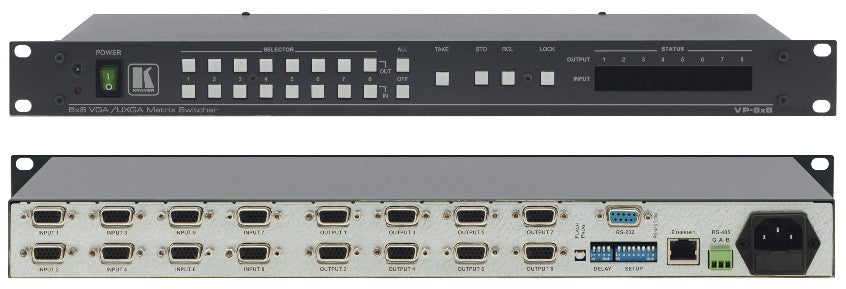 The VP−8x8 is a high−performance matrix switcher for computer graphics video signals, with resolutions up to and exceeding UXGA on 15−pin HD connectors. It can route any or all inputs to any or all outputs simultaneously.- High Bandwidth - 400MHz (−3dB) fully loaded.- HDTV Compatible.- Active Input Indication Reporting - Each input button on the front panel automatically lights up when the unit detects a video signal on that input. When an input is selected to be switched, the button changes to a different color to indicate it is the active input.- Delayed Switching - Up to a 4sec (user selectable) delay for clean switching.- Flexible Control - Front panel, RS−232 (K−Router™ Windows®−based Kramer software is included), RS−485, Ethernet & IR remote (included).- Front Panel Control Lockout.- Take Button - Executes multiple switches all at once.- Memory Locations - Stores multiple switches as presets to be recalled and executed when needed.- Standard 19” Rack Mount Size - 1U.