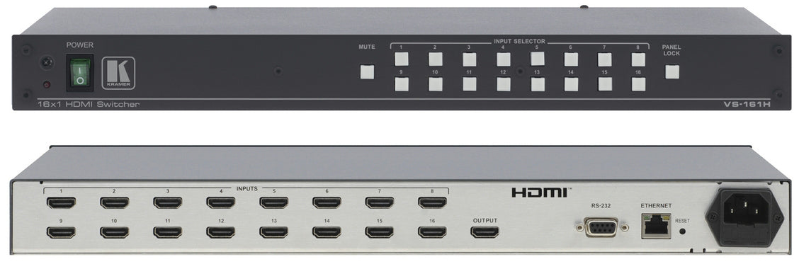 The VS-161H is a high-performance switcher for HDMI signals. It reclocks and equalizes the signal and switches one of the 16 inputs to a single HDMI output.- Max. Data Rate - 1.65Gbps.- HDCP Compliant.- HDTV Compatible.- I-EDIDPro Kramer Intelligent EDID Processing - Intelligent EDID handling & processing algorithm ensures Plug and Play operation for HDMI systems.- HDMI Support - HDMI (V.1.3 with Lip Sync, CEC).- Dual Mode - PC and DVD Modes selectable by input.- Flexible Control Options - Front panel, RS-232 (K-Router Windows-based software is included), Ethernet & IR remote (included).- Video Disconnect.- Front Panel Lockout.- Kramer Equalization & re-Klocking™ Technology - Rebuilds the digital signal to travel longer distances.- Worldwide Power Supply - 100-240V AC.- Standard 19” Rack Mount Size - 1U. Rack "ears" included.