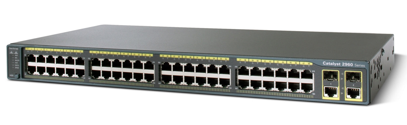 Cisco® Catalyst® 2960 Series Intelligent Ethernet Switches are a new family of fixed-configuration standalone devices that provide desktop Fast Ethernet and Gigabit Ethernet connectivity, enabling enhanced LAN services for entry-level enterprise, mid-market, and branch office networks. The Catalyst 2960 Series offers integrated security, including network admission control (NAC), advanced quality of service (QoS), and resiliency to deliver intelligent services for the network edge.The Cisco Catalyst 2960 Series offers:- Intelligent features at the network edge, such as sophisticated access control lists (ACLs) and enhanced security- Dual-purpose uplinks for Gigabit Ethernet uplink flexibility, allowing use of either a copper or a fiber uplink-each dual-purpose uplink port has one 10/100/1000 Ethernet port and one Small Form-Factor Pluggable (SFP)-based Gigabit Ethernet port, with one port active at a time- Network control and bandwidth optimization using advanced QoS, granular rate limiting, ACLs, and multicast services- Network security through a wide range of authentication methods, data encryption technologies, and network admission control based on users, ports, and MAC addresses- Easy network configuration, upgrades, and troubleshooting using Cisco Network Assistant software- Auto-configuration for specialized applications using Smartports