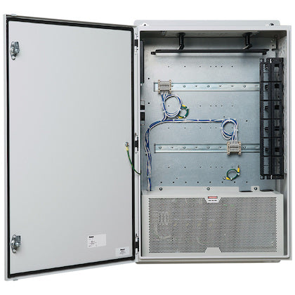 Universal Network Zone System, 24" x 36", mild steel enclosure, for two industrial switches, includes (16) Cat 6A STP copper patch cords and jacks, (4) MM LC fiber uplink patch cords with (6) adaptors and redundant power supplies, battery UPS.